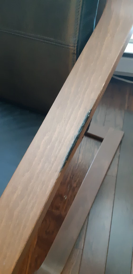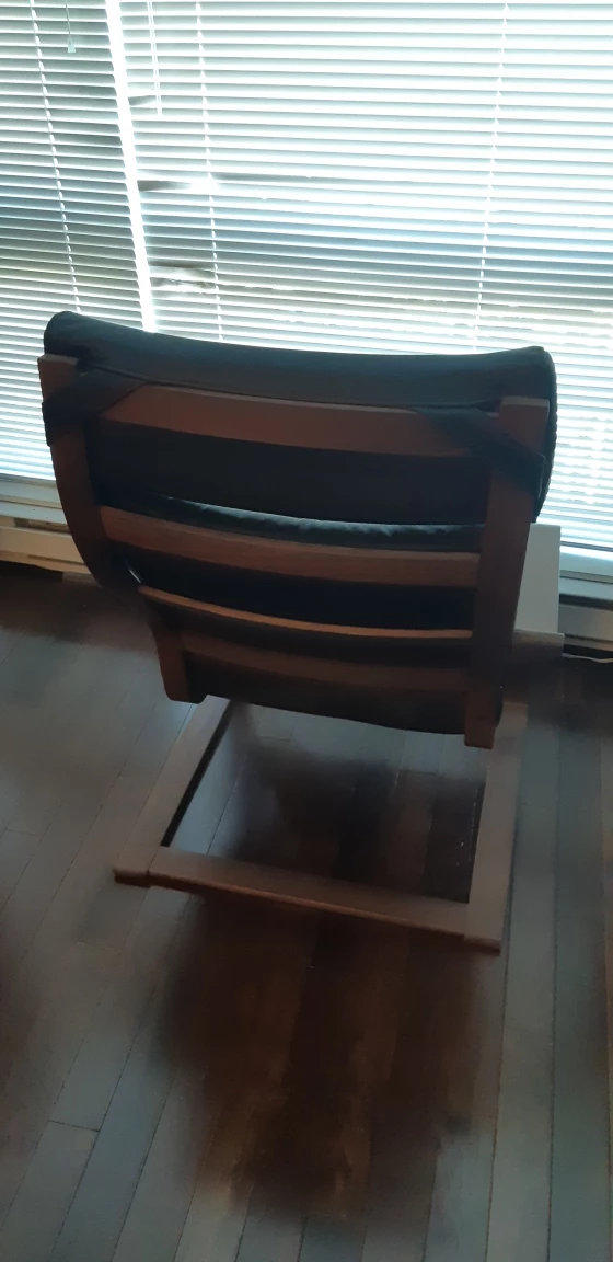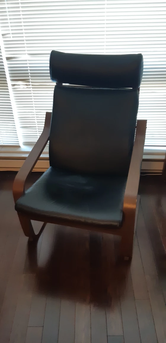 Selling my ikea poang leather armchair as I never use it, leather is immaculate, great condition other than one splinter along the left arm's edge which has been filled with black touch-up furniture wax as a temporary fix.