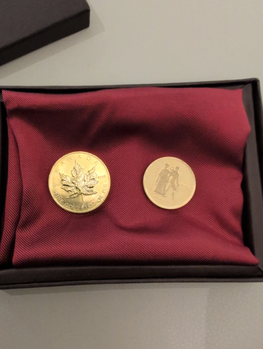 This lot includes a 1987 Canadian 50 Dollars gold coin featuring Queen Elizabeth II and a 1 oz Canadian Gold Maple Leaf coin. Both coins appear to be in good condition. They come presented in a protective box with a red satin lining.