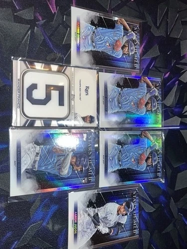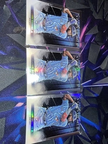This lot includes 2022 Topps #JNM-WF Wander Franco Jersey Number Medallion Commemorative Relics RC, 2022 Topps Stars of MLB #SMLB-20 Wander Franco RC (x2), and 3x Vladimir Guerrero Jr. 2022 Topps Series 1 Stars Of MLB Toronto Blue Jays SMLB-22 cards. Feel free to message if you have any questions!