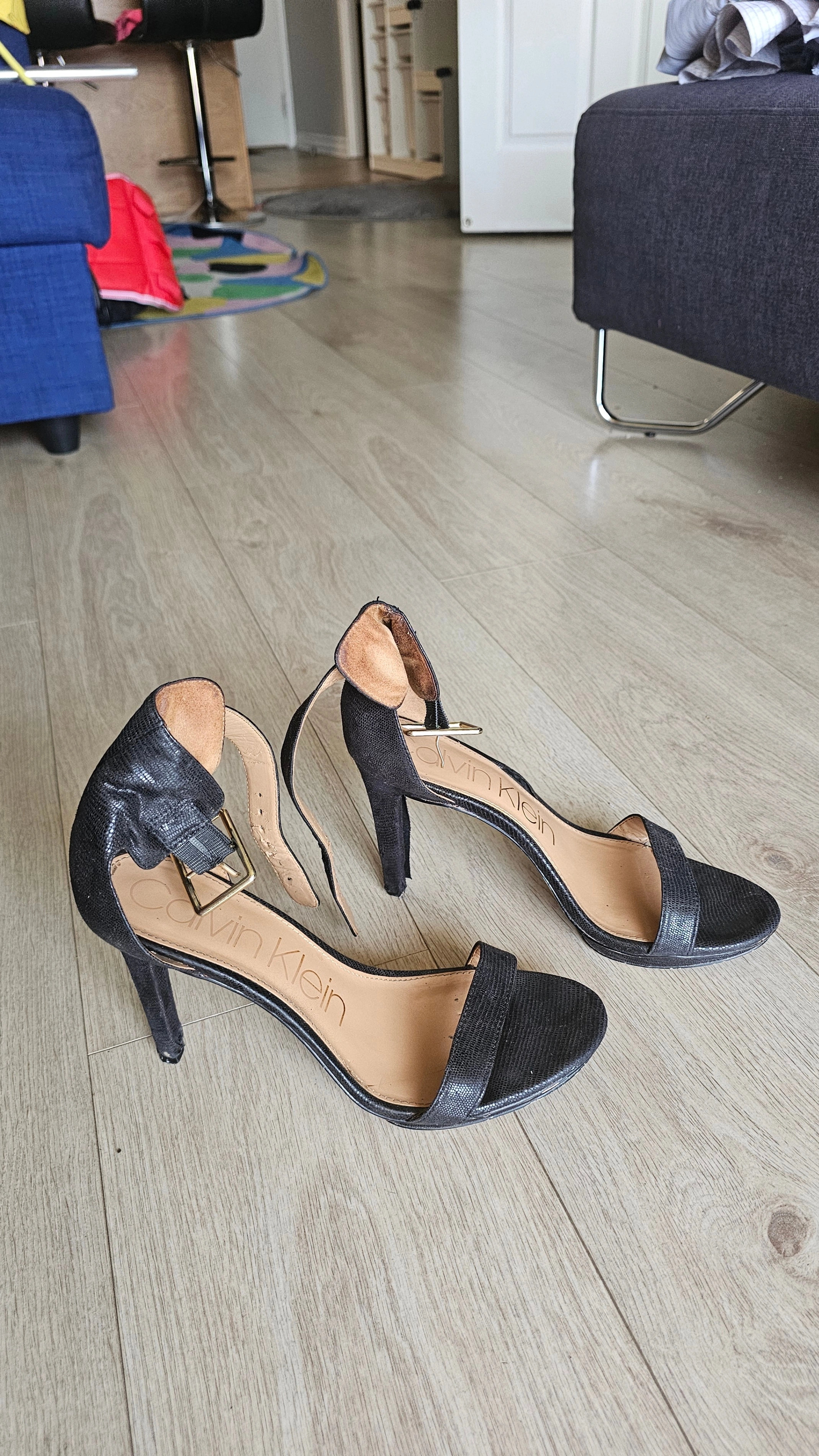 Black Calvin Klein heels with a strappy design. They show some signs of wear, especially on the soles, but still have lots of life left!