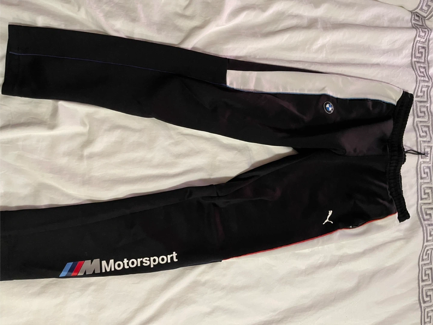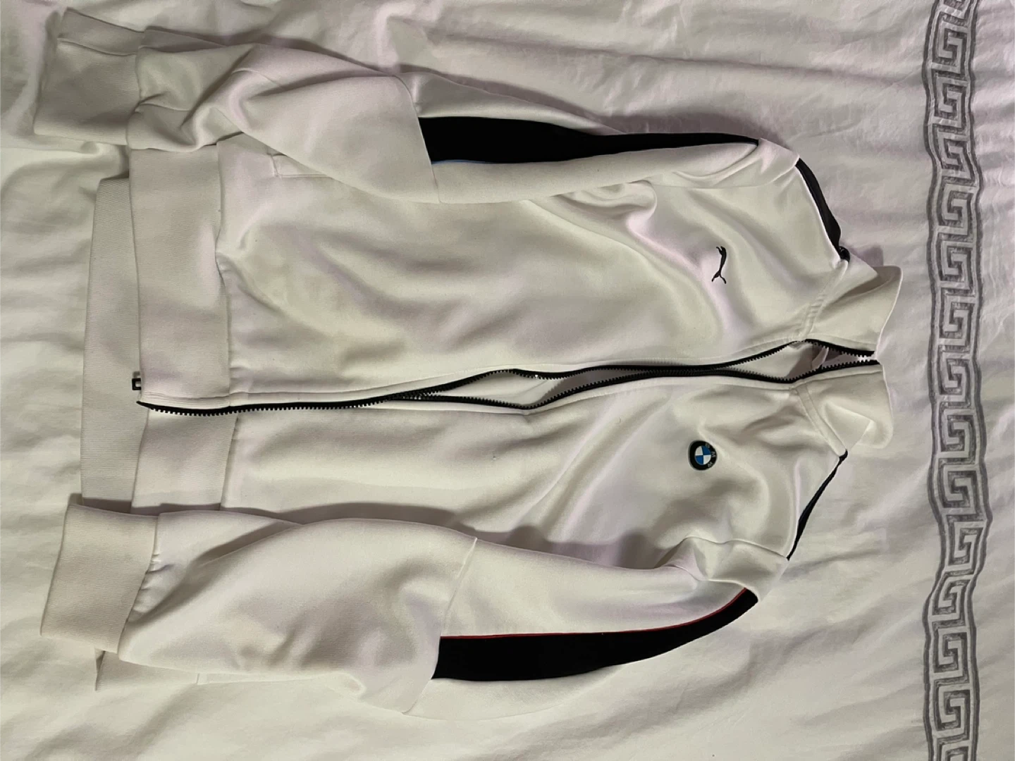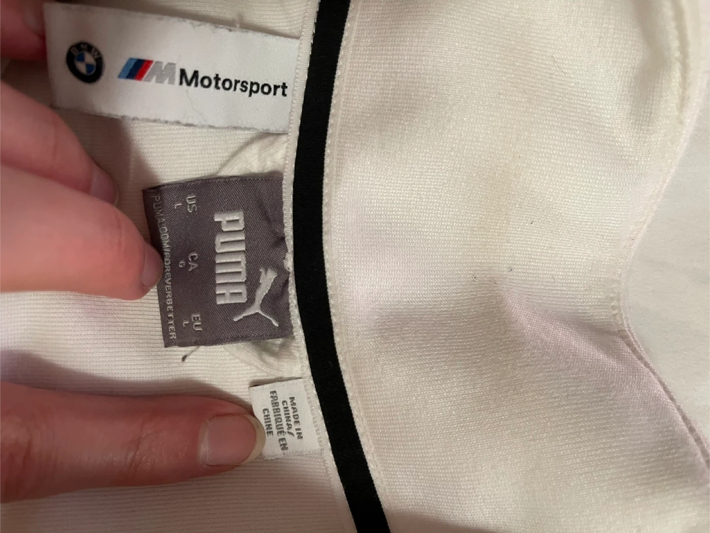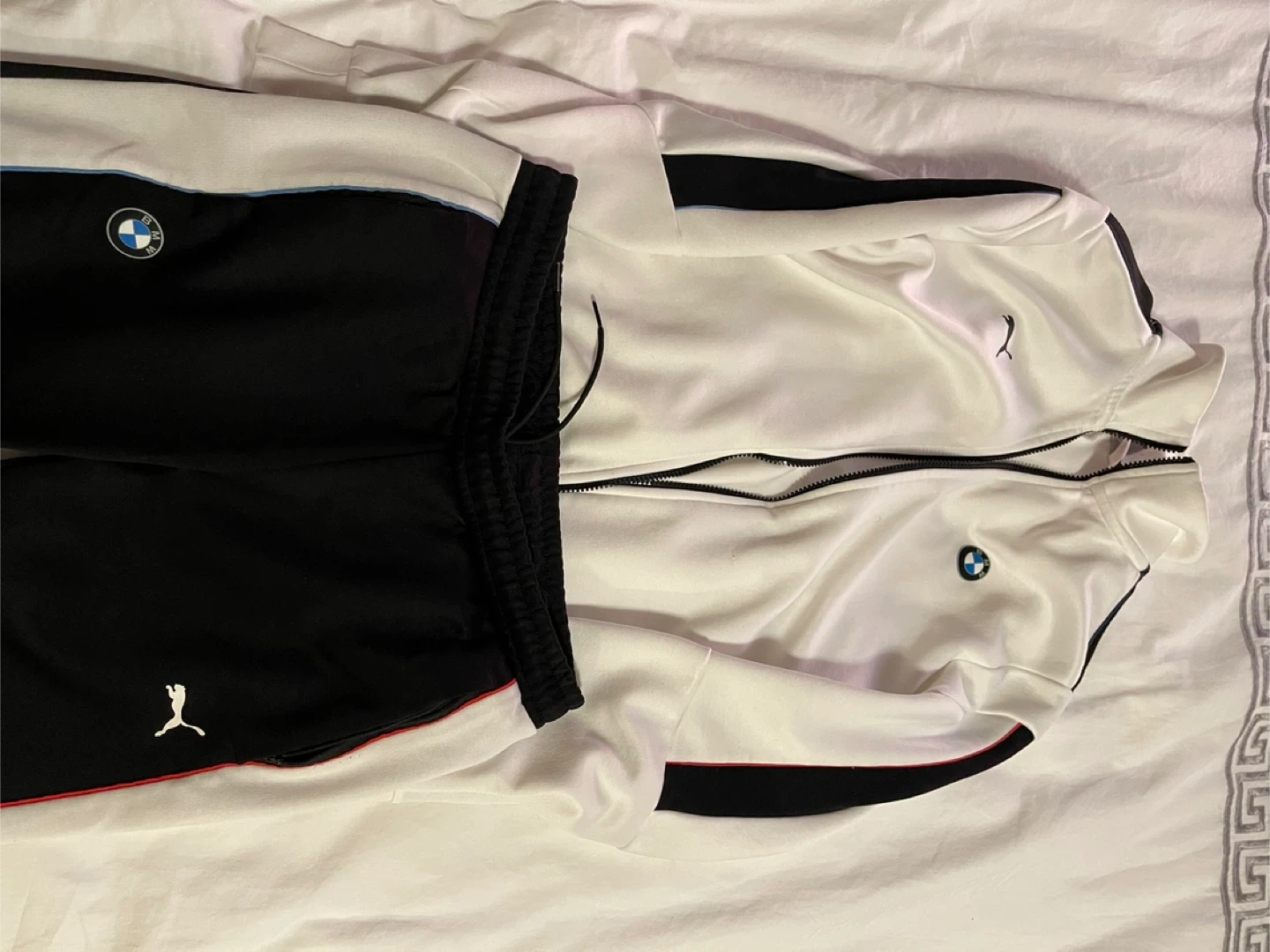 This is a Puma BMW Motorsport track jacket and pants set. Jacket is size L, pants are size M. Both are white and black with Motorsport accents.