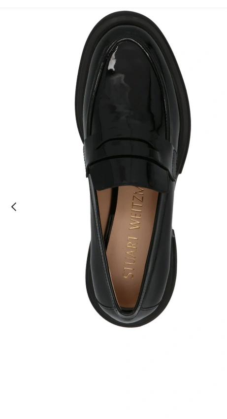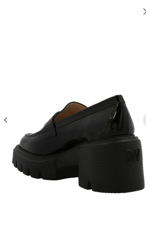 Check out these stylish Stuart Weitzman loafers! They feature a sleek black patent leather finish and a chunky heel for a bit of extra height and a modern look. Perfect for adding a touch of sophistication to any outfit!