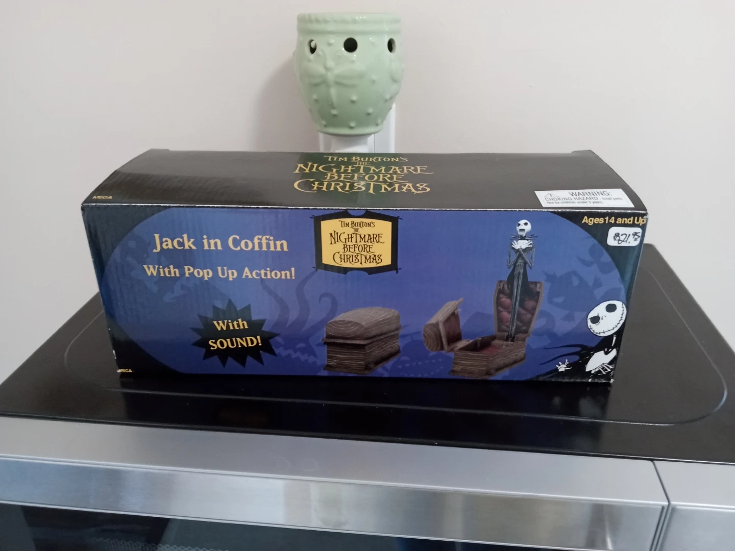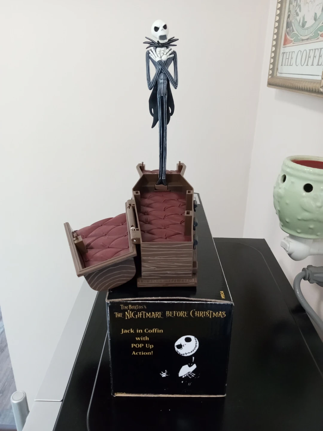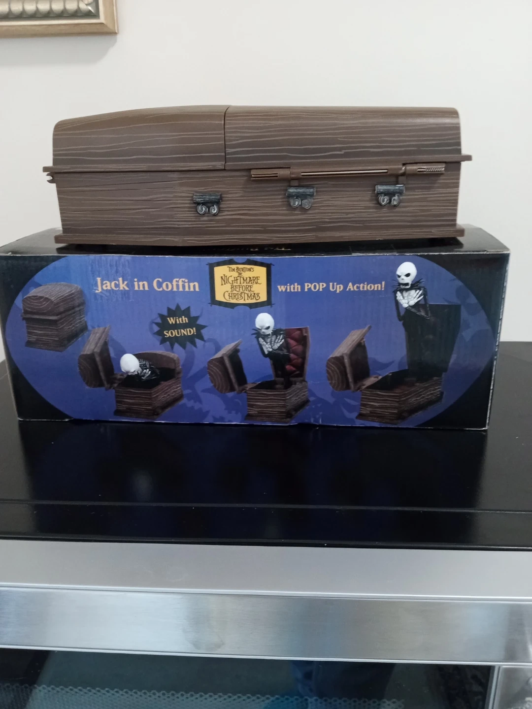 This is Tim Burton's The Nightmare Before Christmas Jack in Coffin toy! It features Jack Skellington with pop-up action and sound when the coffin opens. Recommended for ages 14 and up. Needs a new battery for audio effects.