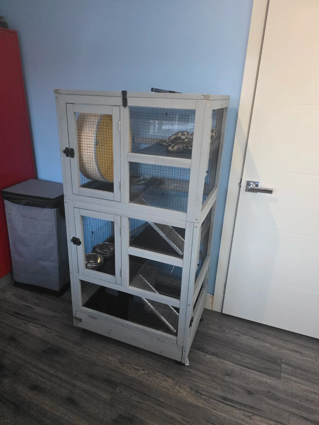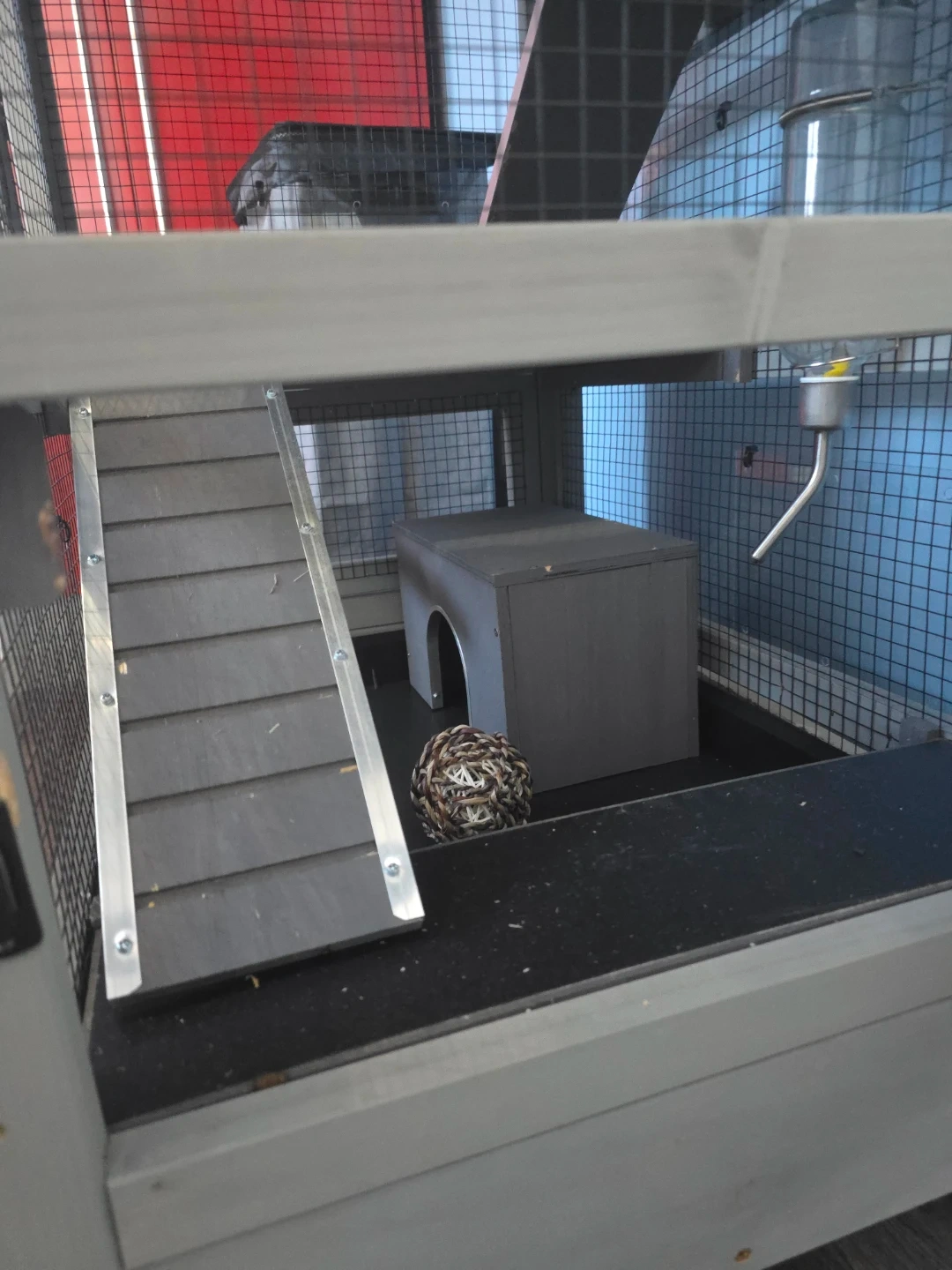 Spacious multi-level cage for small pets like rabbits or chinchillas. Includes a wheel, ramps, bowls, and a hideout. Also comes with a bag of Oxbow Hay Blends and Higgins Sunburst food. Some extra plastic panels and zip ties are included. It's perfect for giving your small animal plenty of room to play and explore!