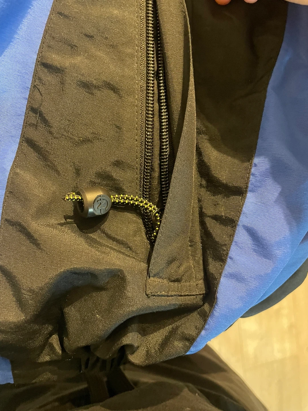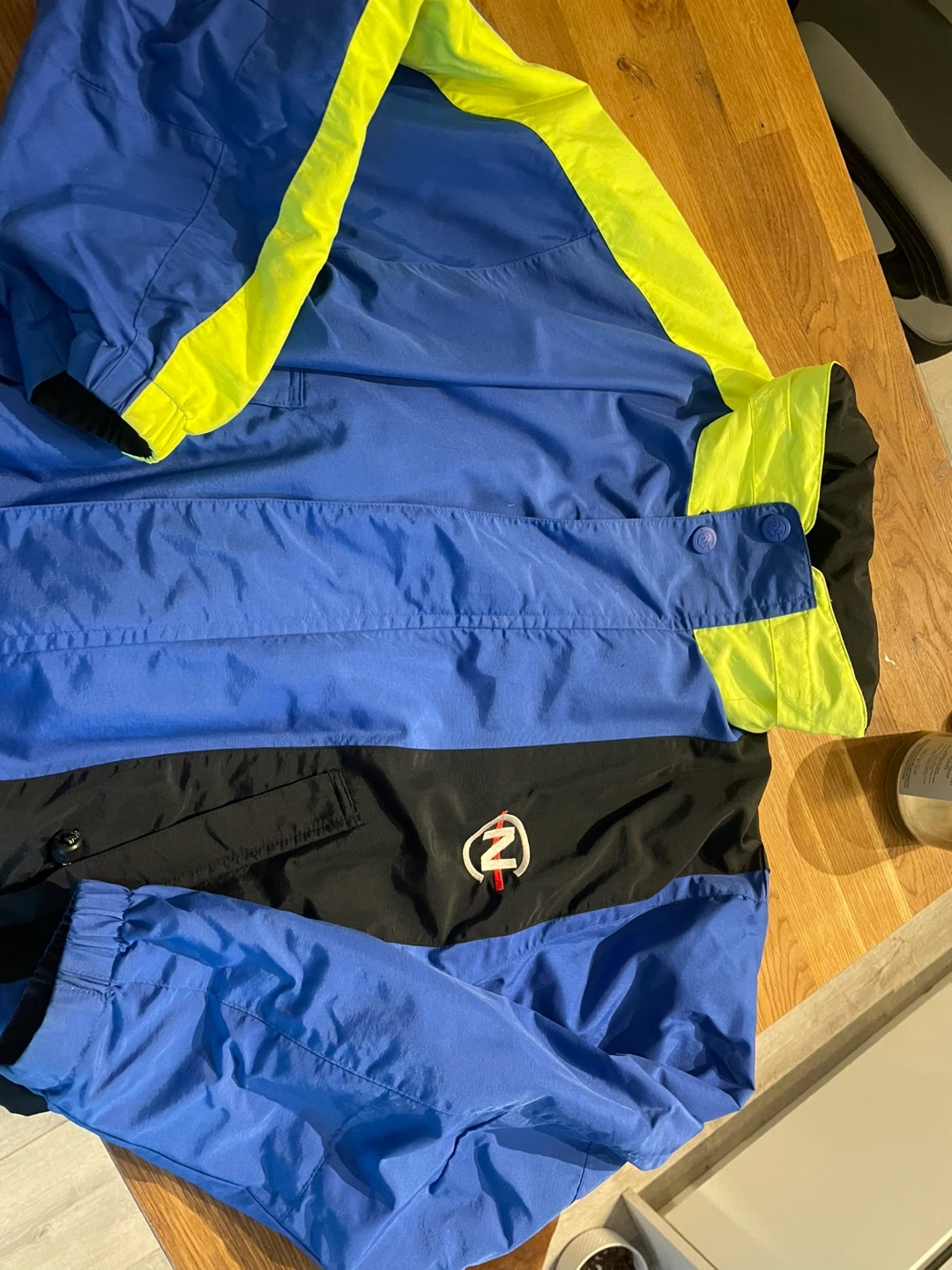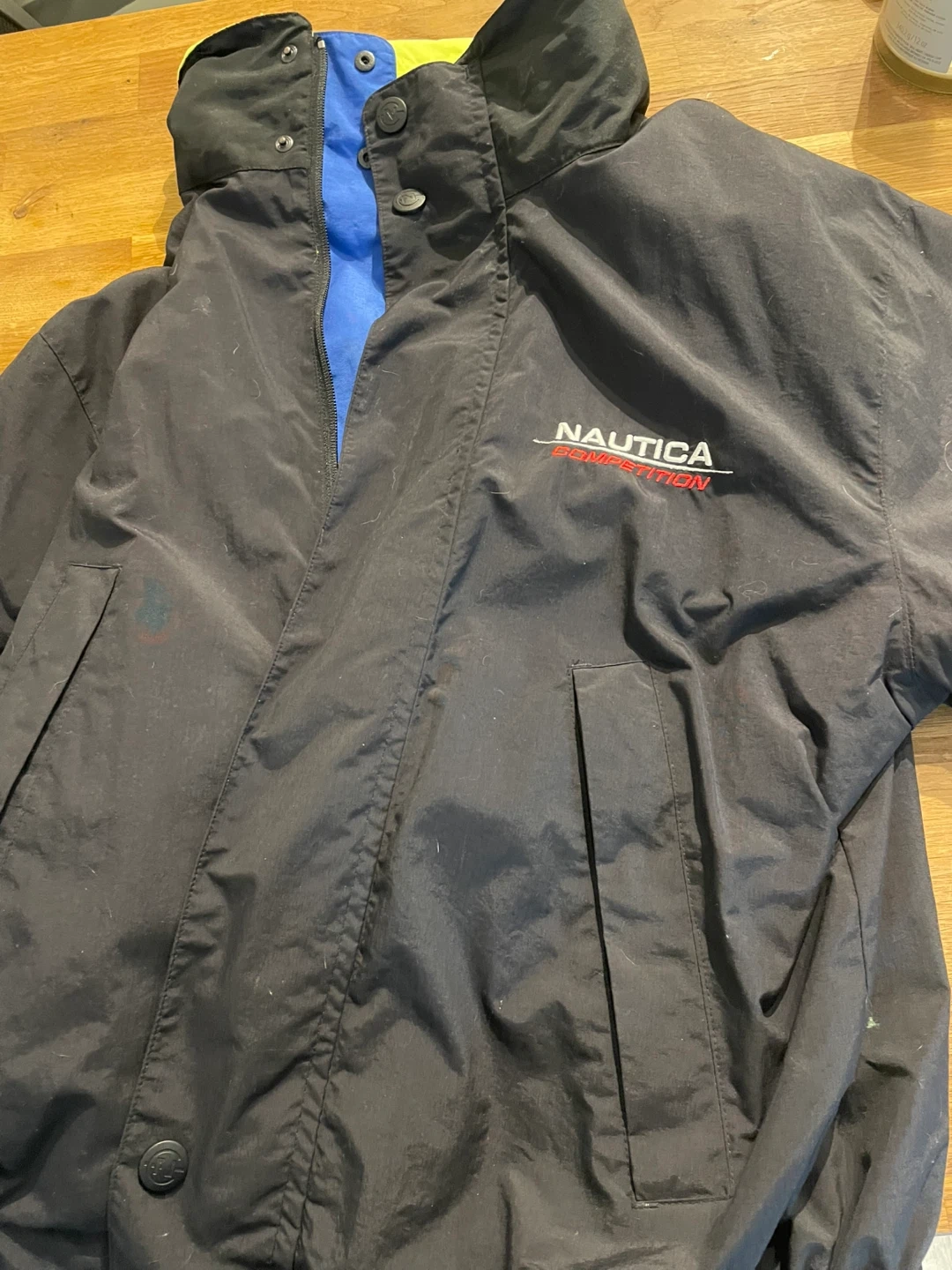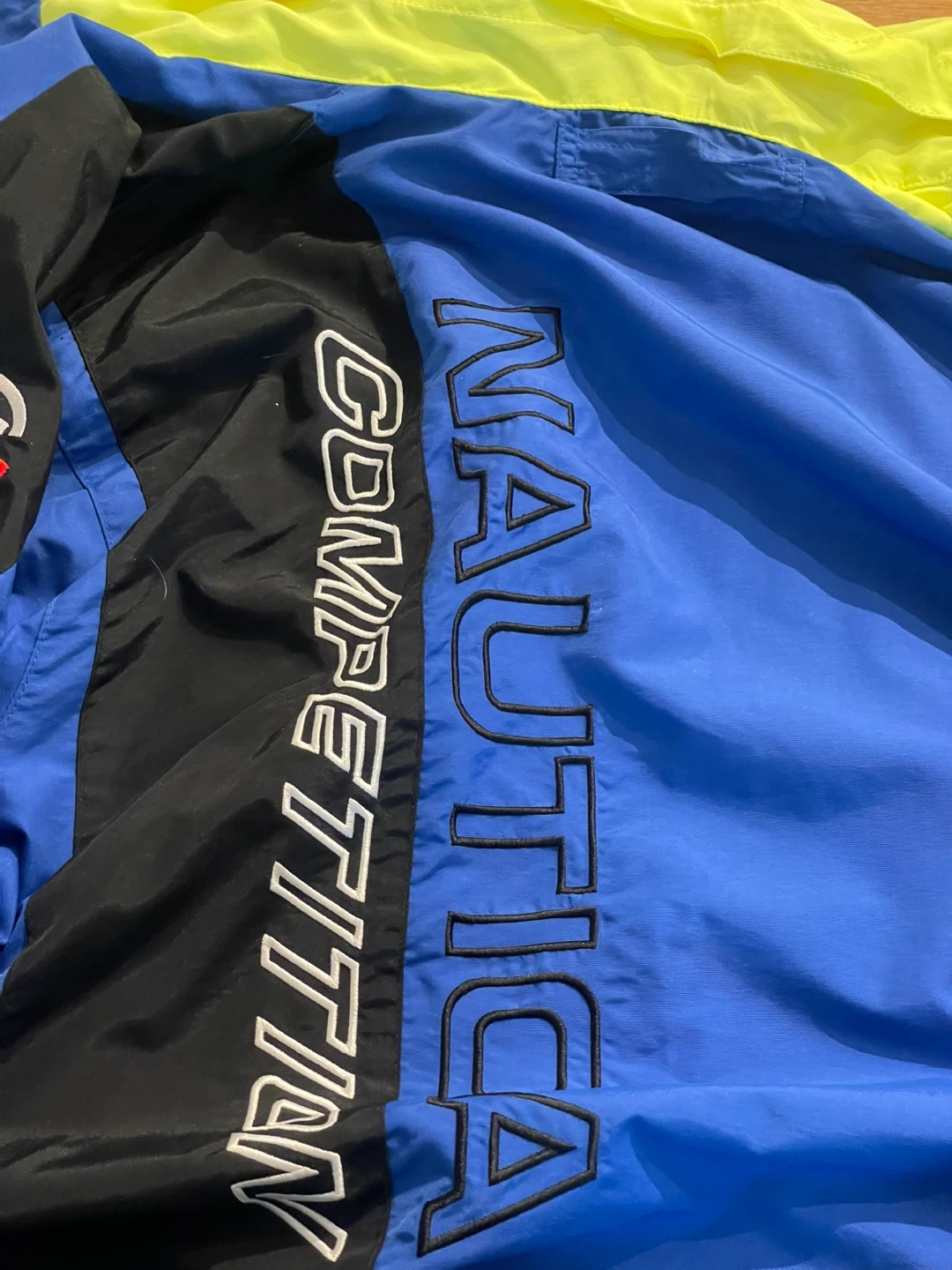 Nautica Competition jacket in blue, black, and yellow. It's a windbreaker style with pockets and a zip closure. Made from nylon material.