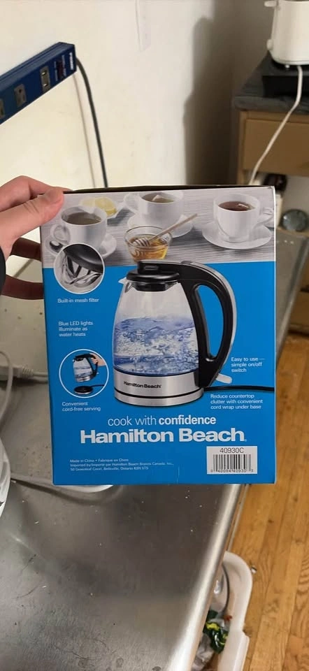 New Hamilton Beach 1.0 Litre glass kettle. This 1500 watt electric kettle has blue LED lights that illuminate while heating. It features boil-dry protection, a built-in mesh filter, and a cord-free serving base with a cord wrap underneath. Model 40930C.