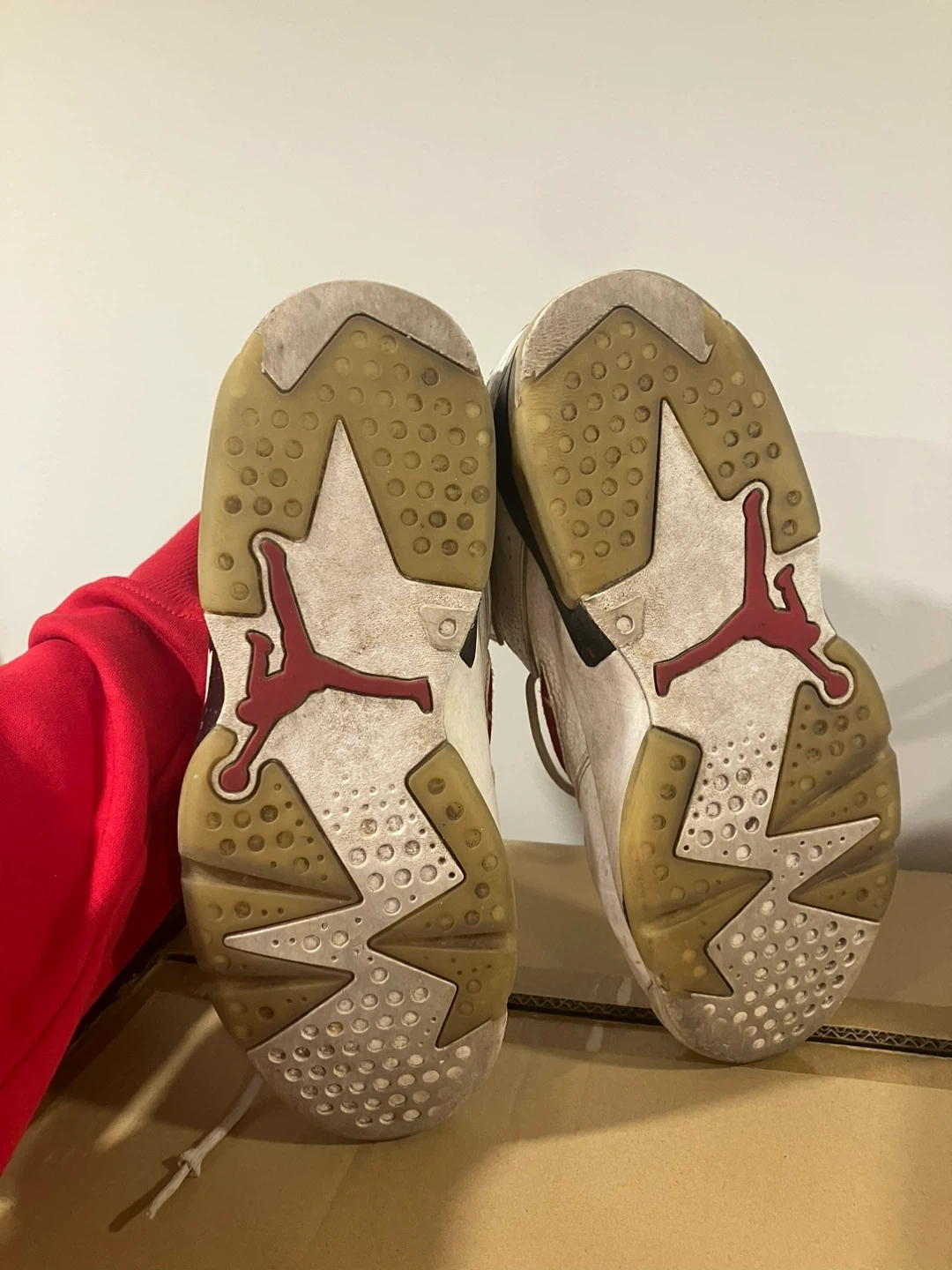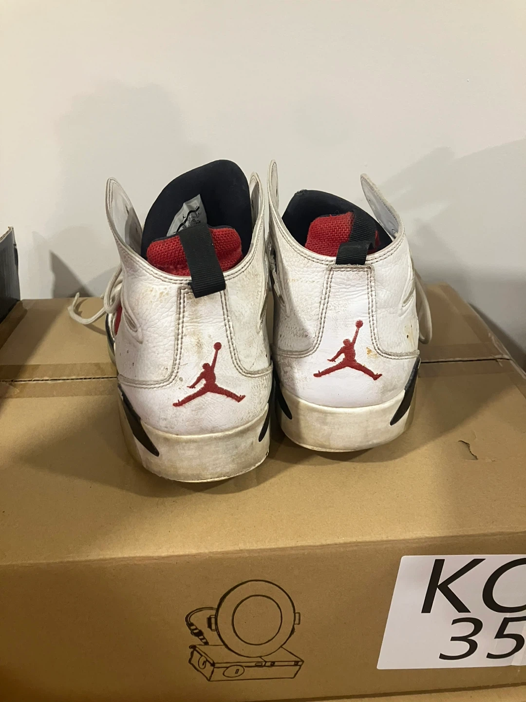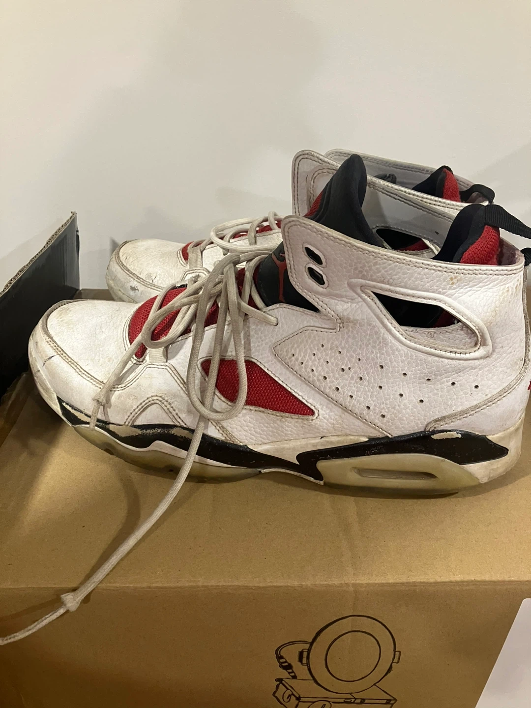 White and red Air Jordan 6 Retro basketball shoes. Leather and synthetic upper with a rubber sole. These sneakers show signs of wear. Perfect for collectors or casual wear!