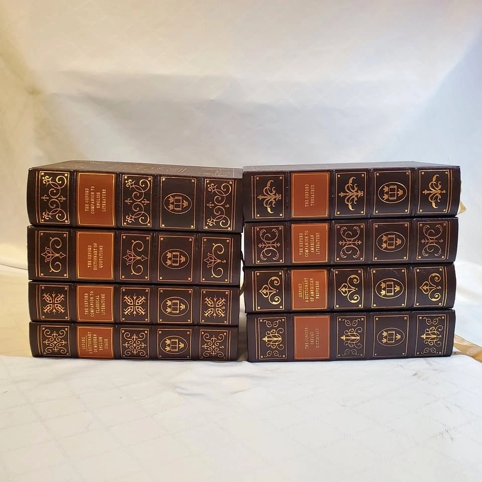 Selling this complete set of 8 Easton Press Oxford books. They are in very good condition, featuring leather-bound covers with 22k gold gilded page edges. The paper is archival quality with a satin bookmark, built to last. The set includes: The Oxford Dictionary of Quotations, A Dictionary of American Proverbs, A Dictionary of Modern English Usage, The Oxford Companion to Classical Literature, The Concise Oxford Dictionary, The Oxford Thesaurus, The Oxford Companion to English Literature, and The Oxford Companion to American Literature. Buyers are welcome to pick up in person. Feel free to message if you have any questions!