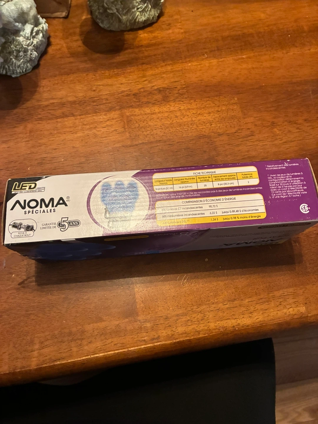 Noma True Glow LED string lights in blue. There are 25 lights on the strand. These are suitable for indoor or outdoor use. They diffuse light for a more traditional glow than normal LEDs.