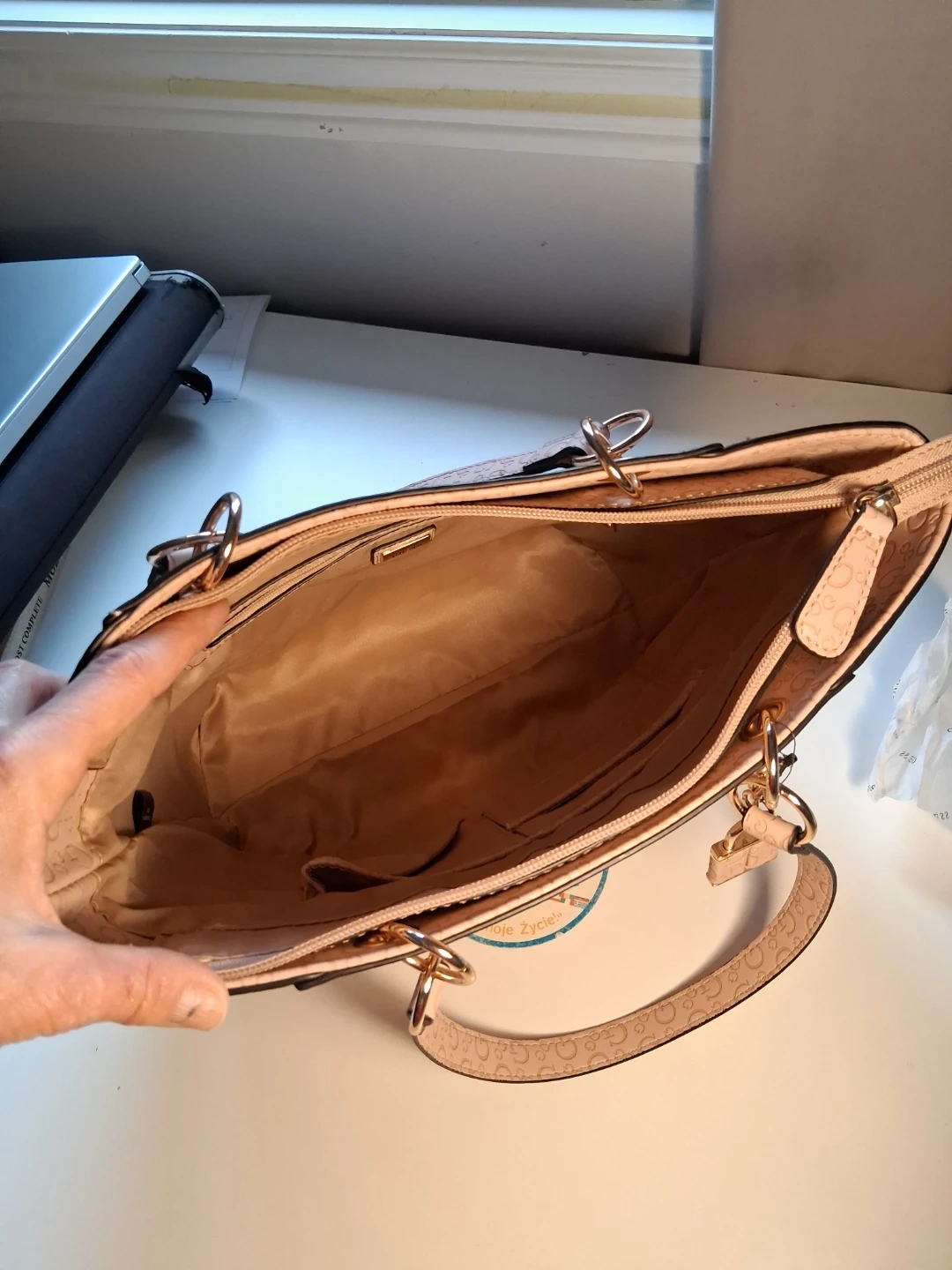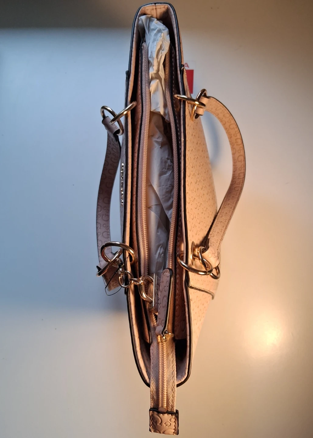 Stylish pale pink tote bag with all-over 'G' logo print. It features gold-tone hardware and a secure zip closure. The interior has multiple pockets for organization.