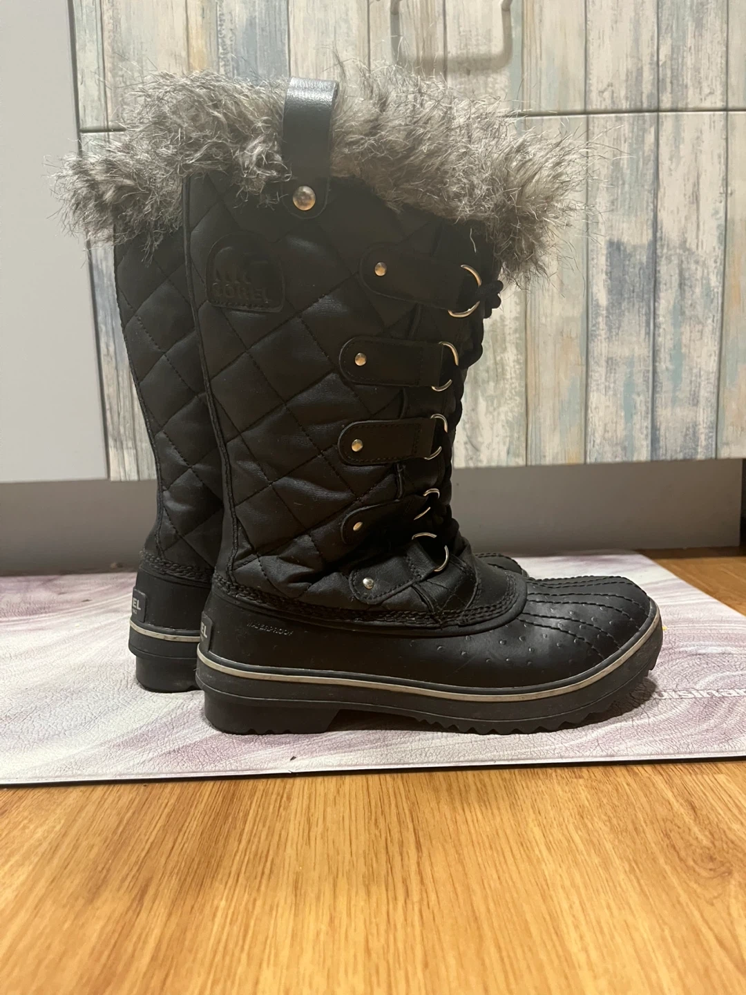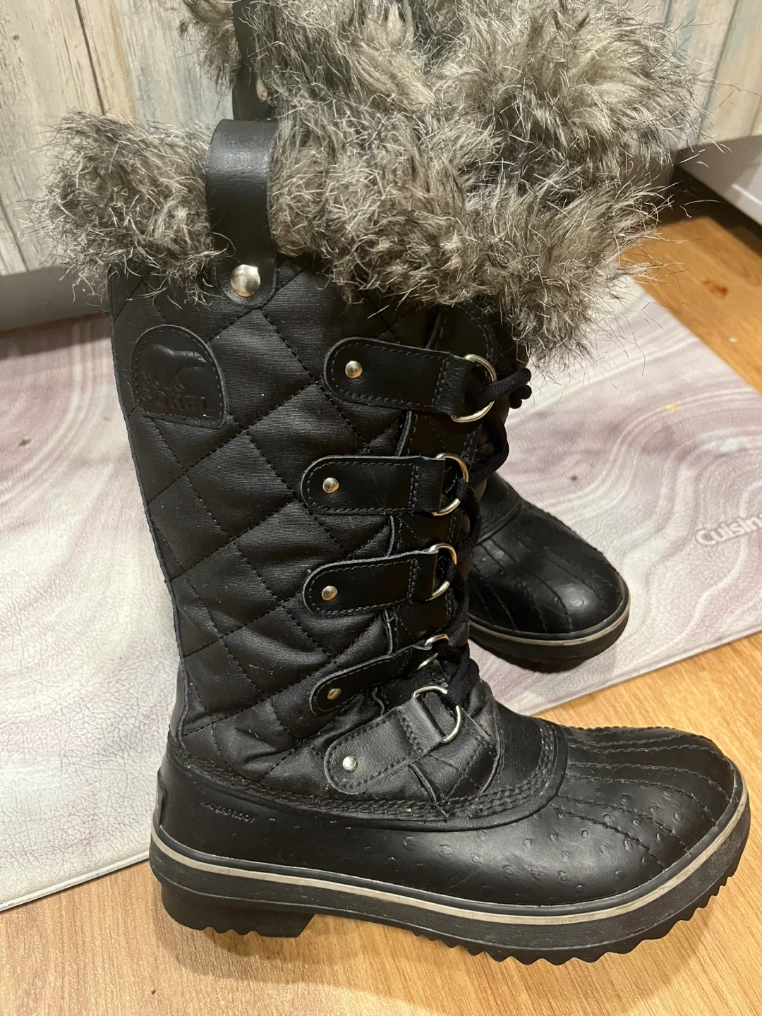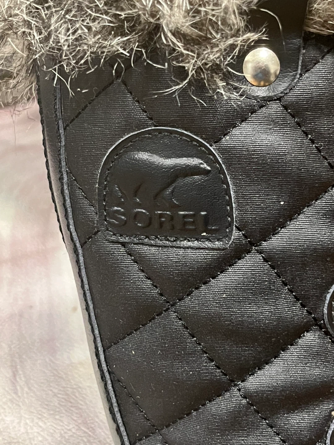 Warm and stylish Sorel winter boots. Features a quilted black upper with a faux fur trim around the top. Waterproof construction for snowy days. Easy to slip on and off.
