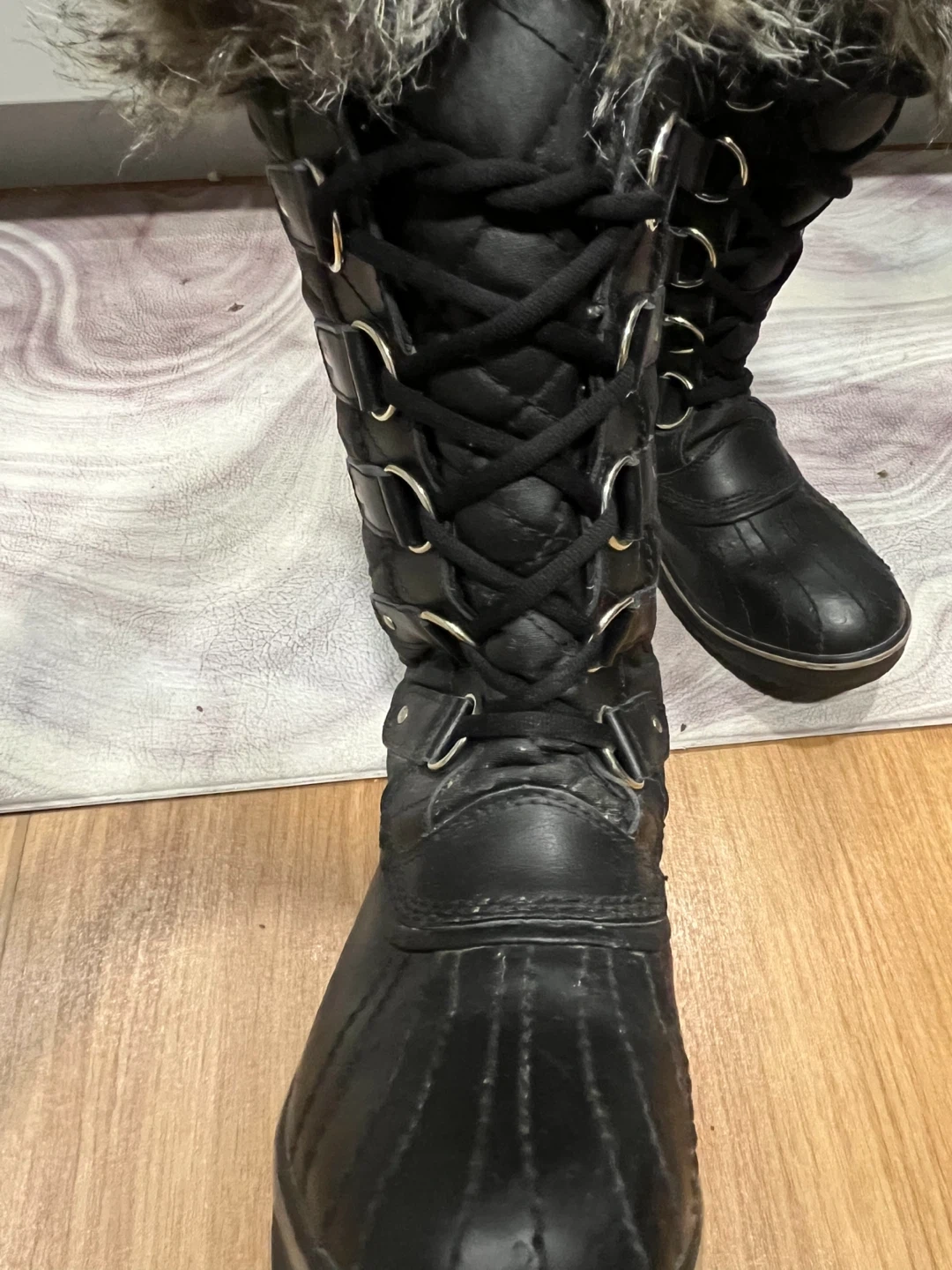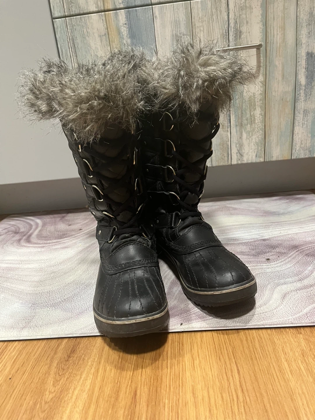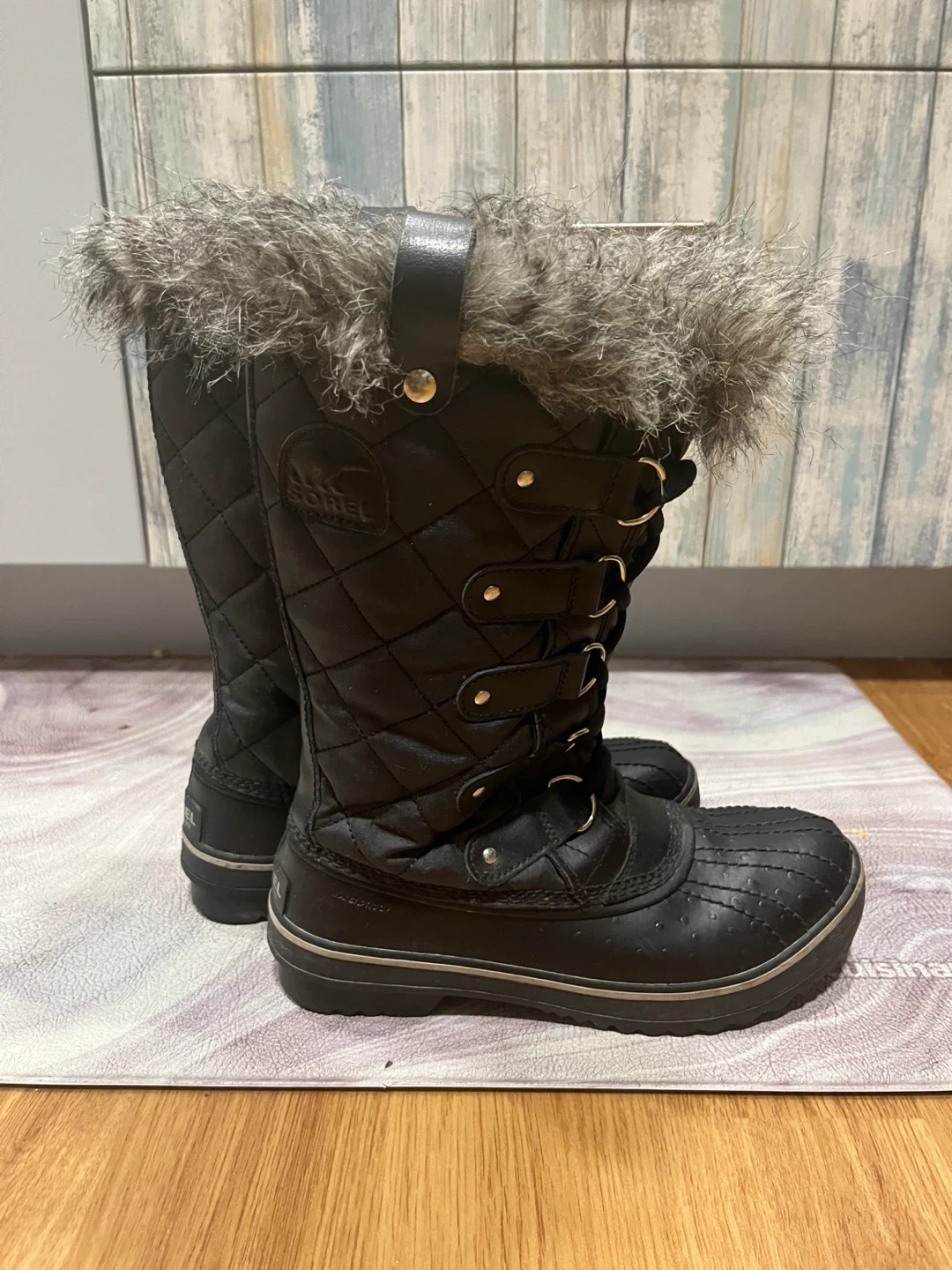 Warm and stylish Sorel winter boots. Features a quilted black upper with a faux fur trim around the top. Waterproof construction for snowy days. Easy to slip on and off.