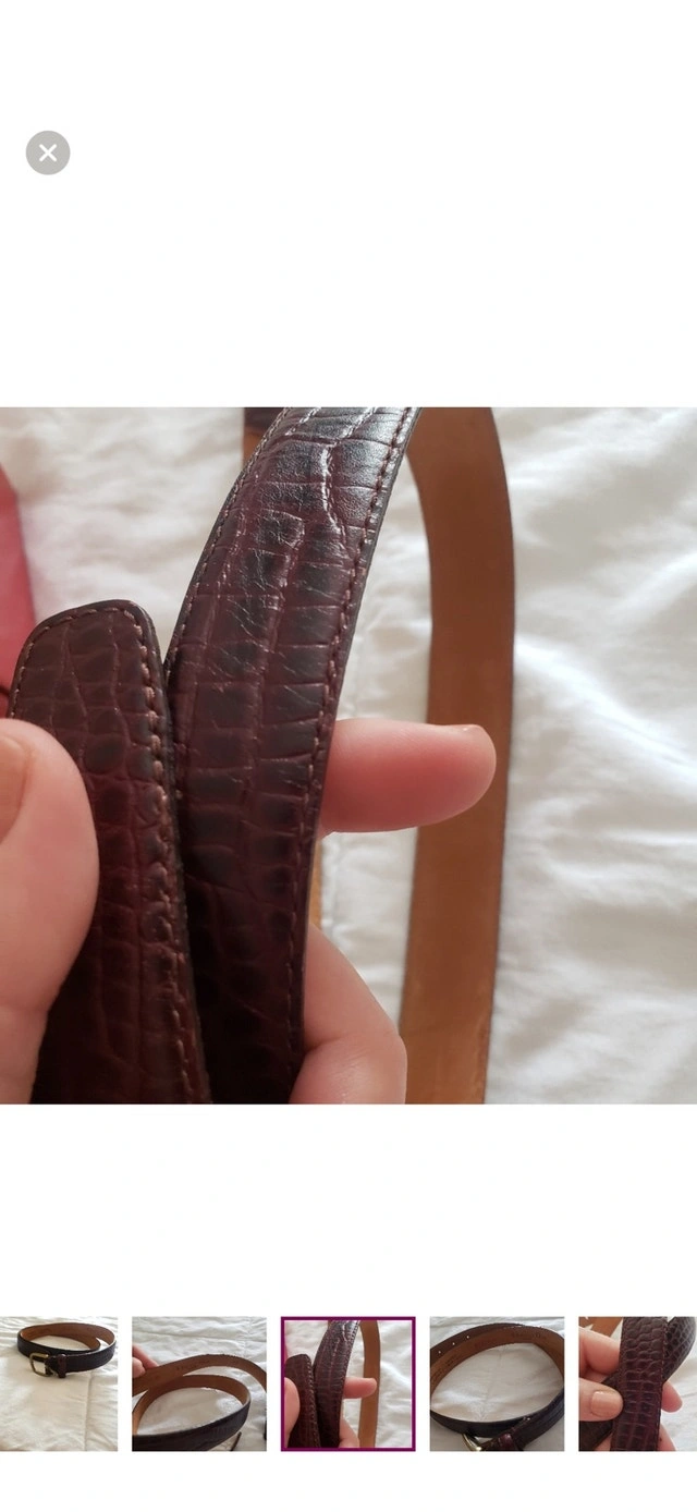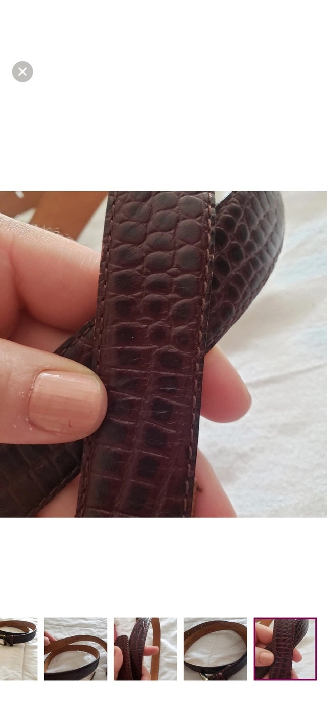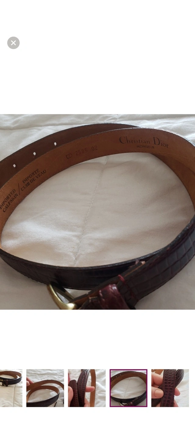 Elevate your wardrobe with this stylish Christian Dior belt, crafted from high-quality calfskin leather with a unique crocodile pattern. The belt features a classic gold-tone buckle, adding a touch of elegance to any outfit. This belt has signs of wear but remains in fair condition, perfect for adding a vintage touch to your style. Brand: Christian Dior, Material: Calfskin Leather, Pattern: Crocodile, Buckle Colour: Gold-Tone. $120 CAD.