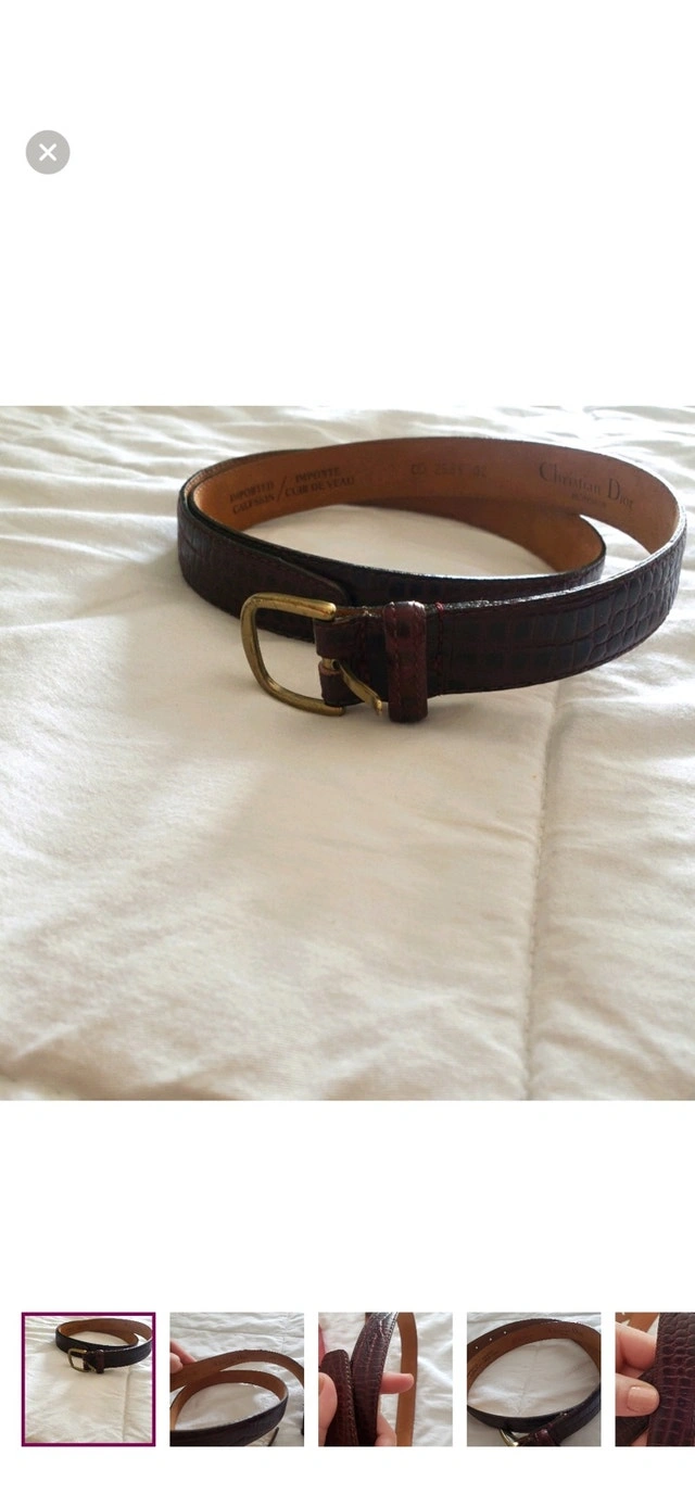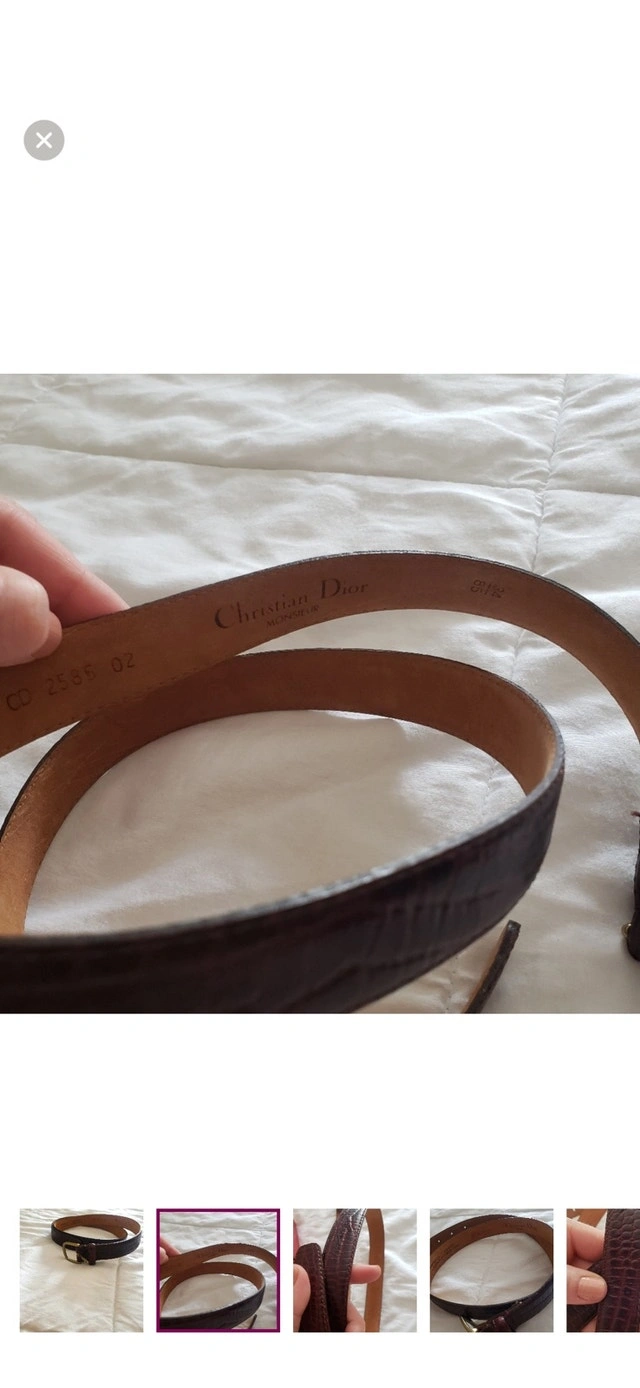 Elevate your wardrobe with this stylish Christian Dior belt, crafted from high-quality calfskin leather with a unique crocodile pattern. The belt features a classic gold-tone buckle, adding a touch of elegance to any outfit. This belt has signs of wear but remains in fair condition, perfect for adding a vintage touch to your style. Brand: Christian Dior, Material: Calfskin Leather, Pattern: Crocodile, Buckle Colour: Gold-Tone. $120 CAD.