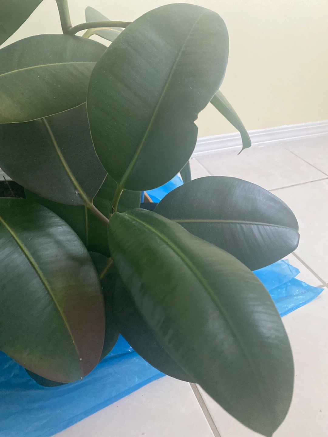 Healthy rubber plant with large, glossy leaves. This plant is known for its air-purifying qualities. Its dark green foliage adds a touch of elegance to any room.