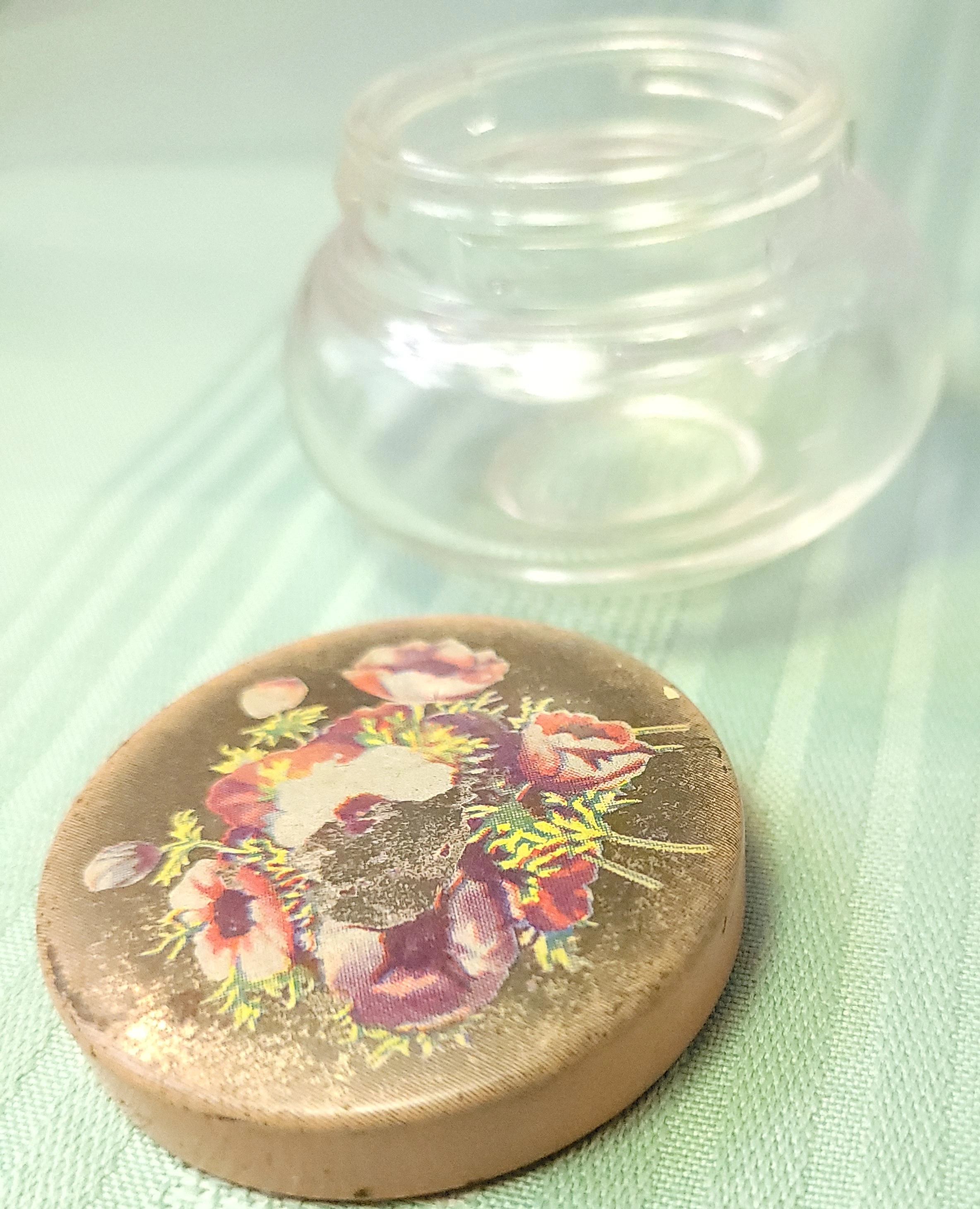 1930s Hazel Atlas Glass Vanity Jar Poppy Flower Litho Metal Lid