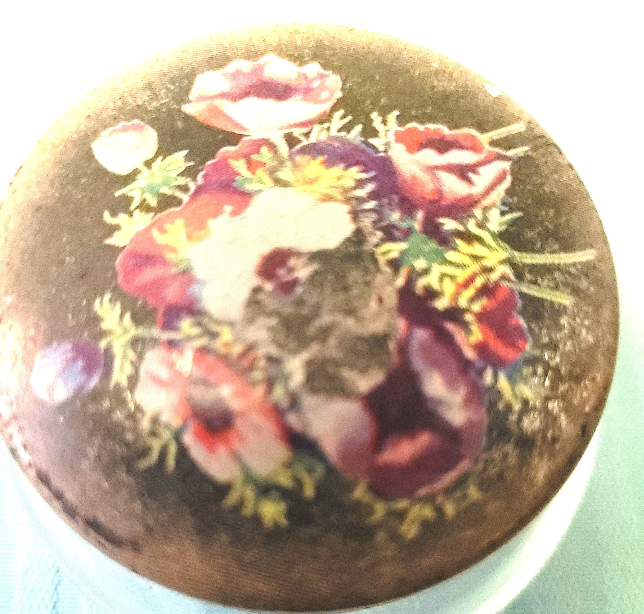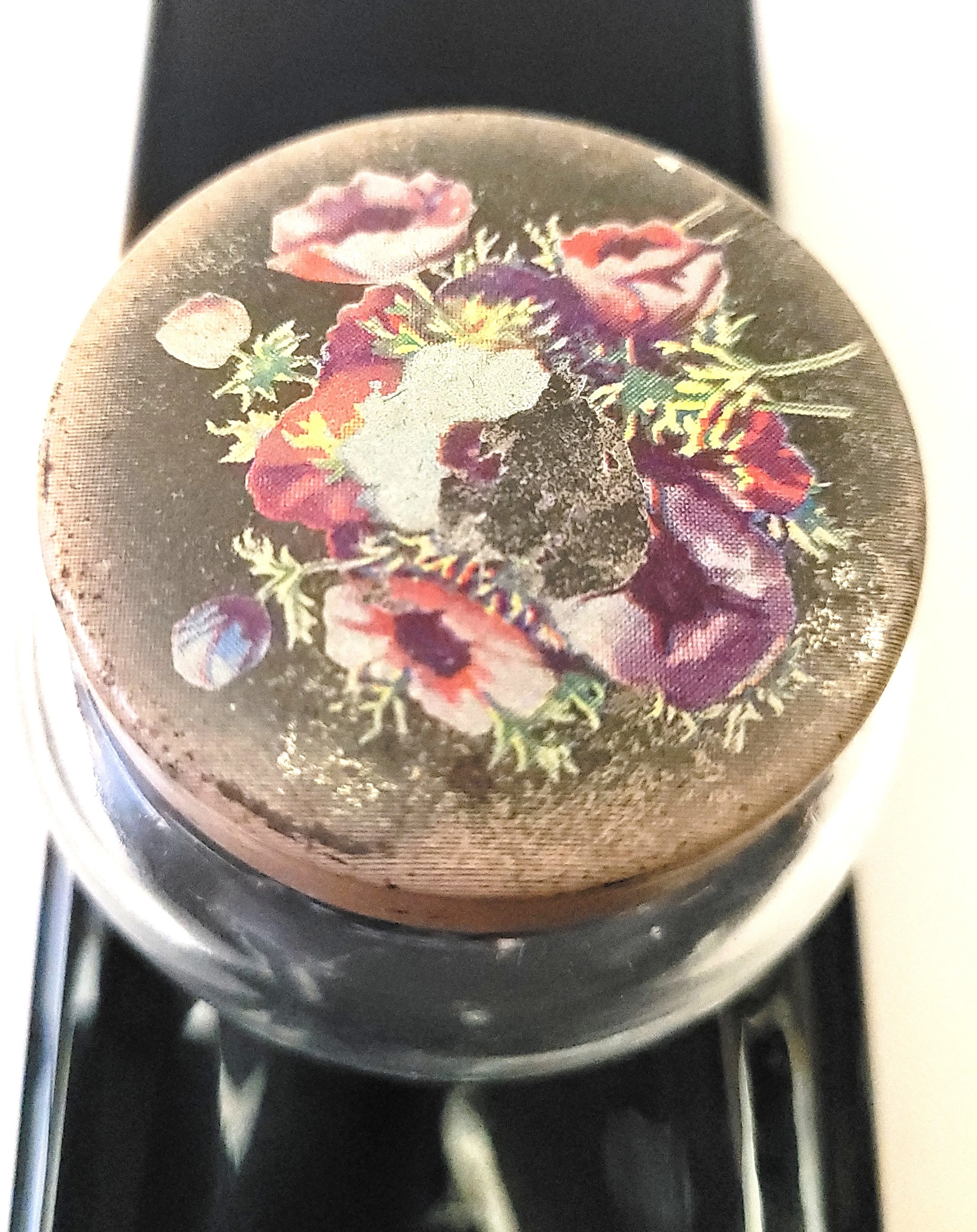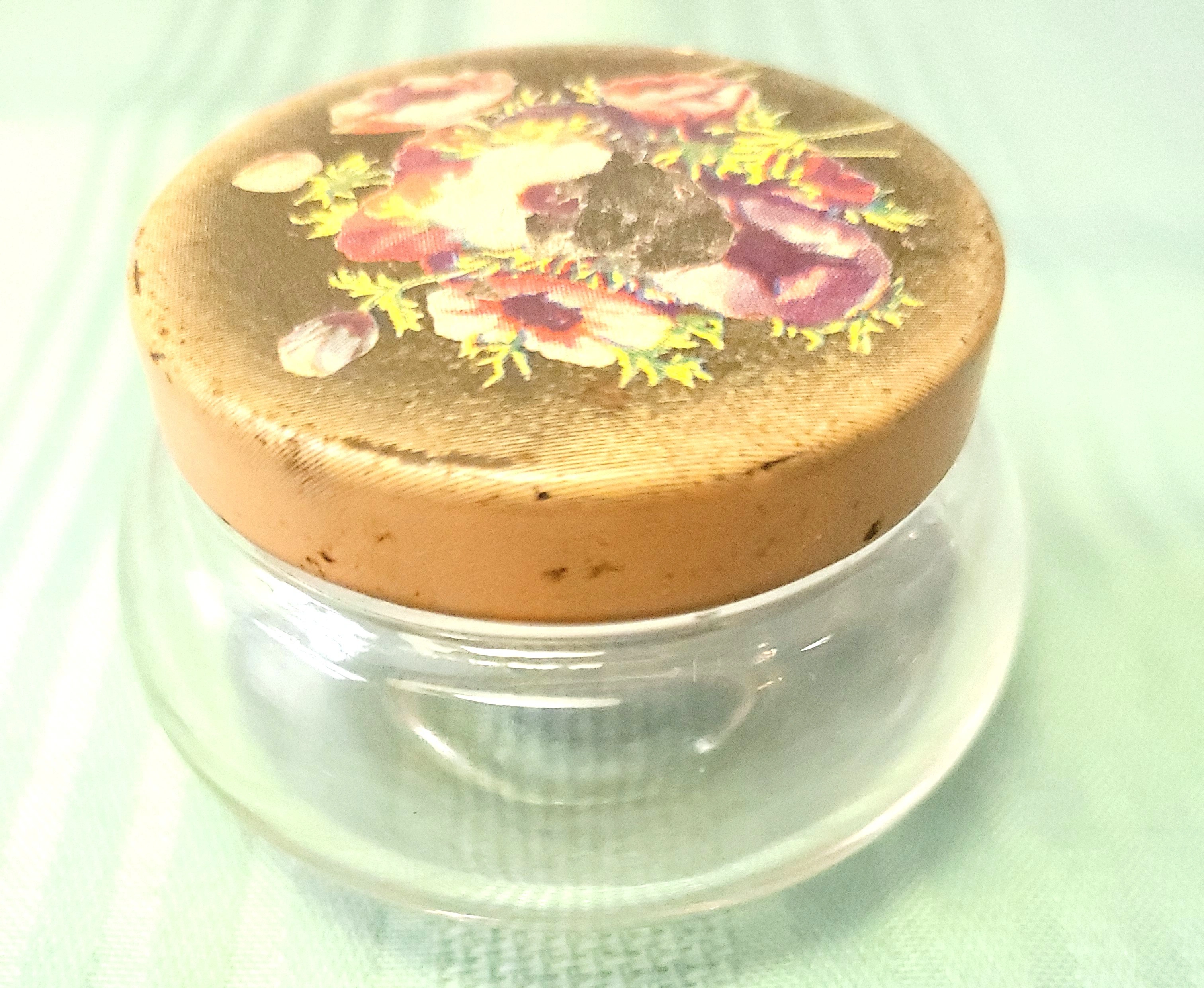 The glass base is intact with no chips or cracks. The metal lid shows light wear consistent with age, including surface scratches and some fading/loss to the central lithographed floral pattern as visible in the photos. Overall, the piece is in good vintage condition.