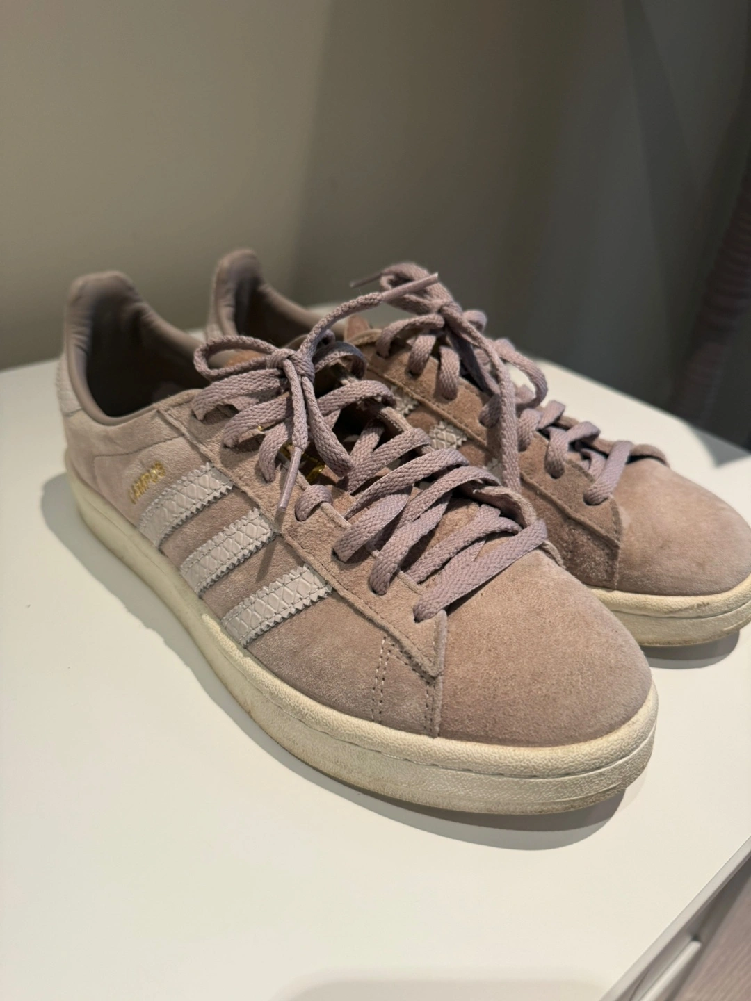 Selling a pair of Adidas Campus sneakers in a lovely neutral colour! These are in great condition and are a size 6. They feature the classic three stripes and a suede upper. Perfect for everyday wear!