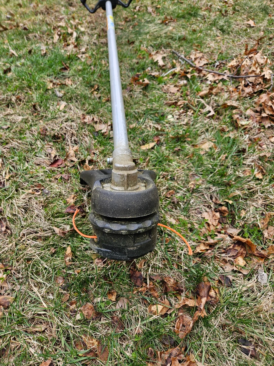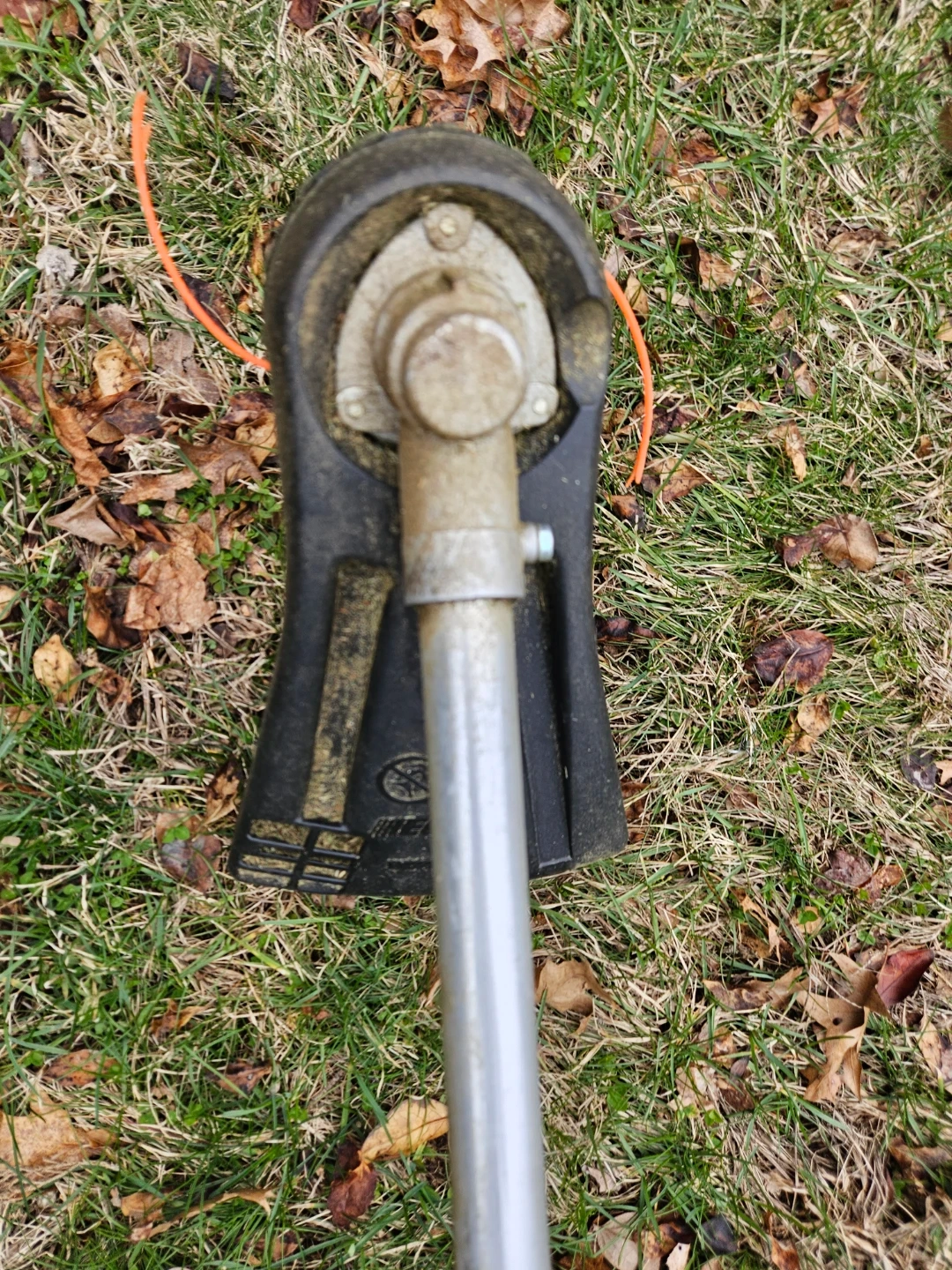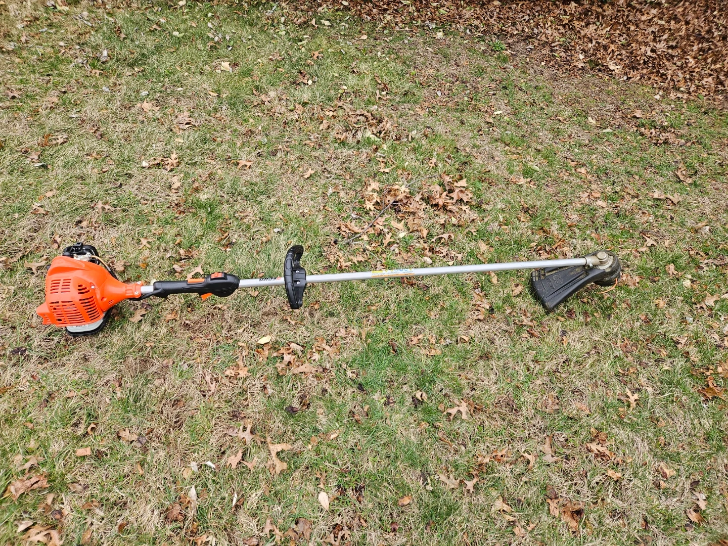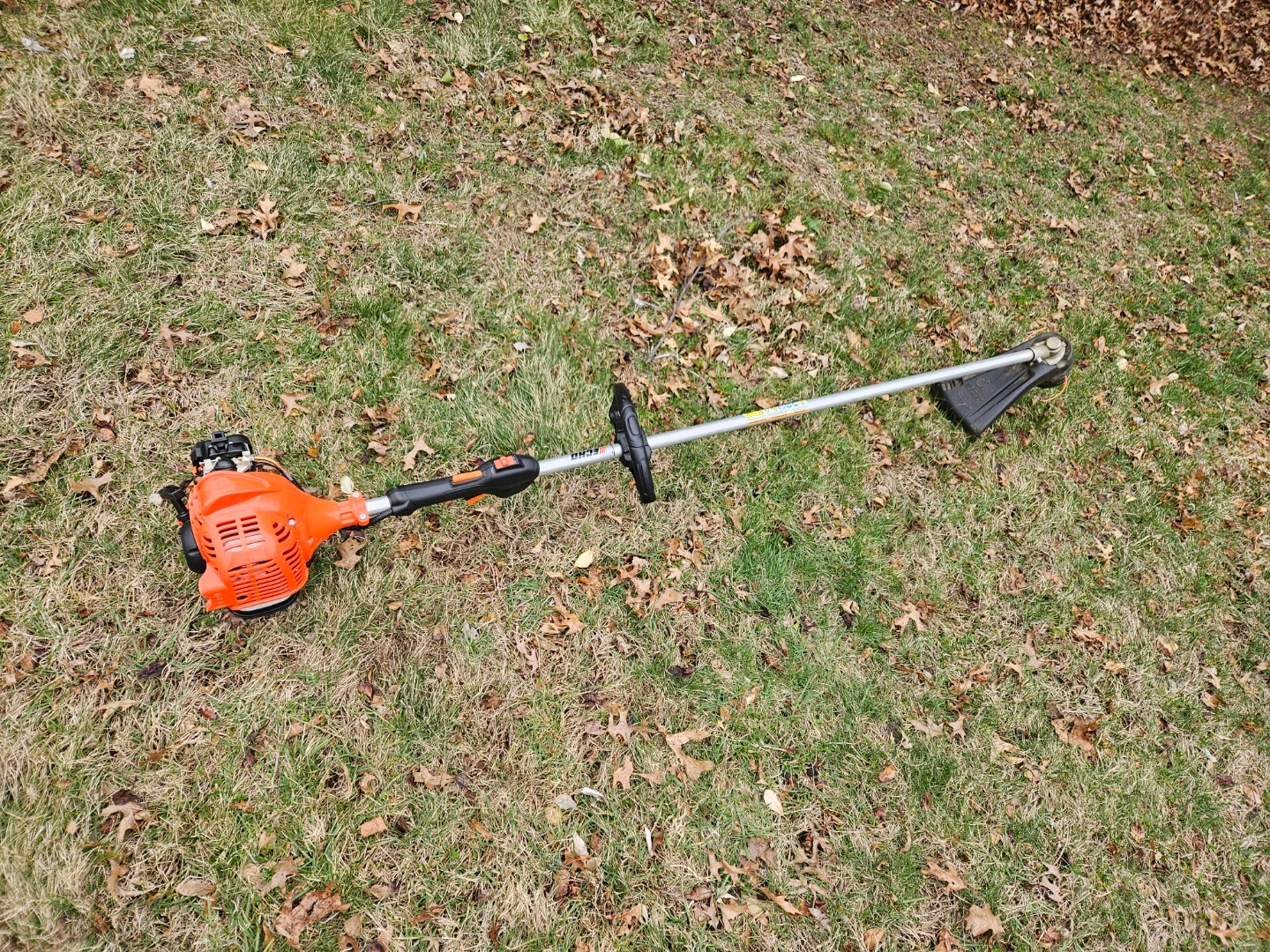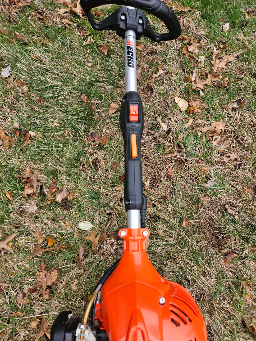 Echo SRM-2120 gas-powered string trimmer. Orange and black color. This trimmer's engine is located at the top of the shaft. It features a curved shaft design. This is a reliable tool for lawn maintenance!