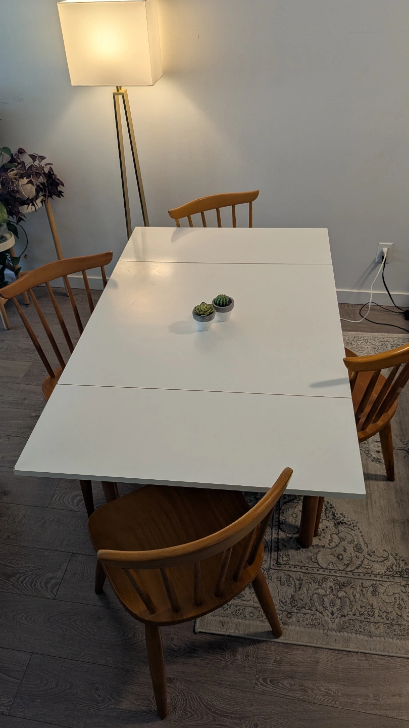 Great condition! This is an IKEA dining table with 4 matching chairs. The table is extendable, perfect for saving space or hosting guests. Clean, smoke-free home.