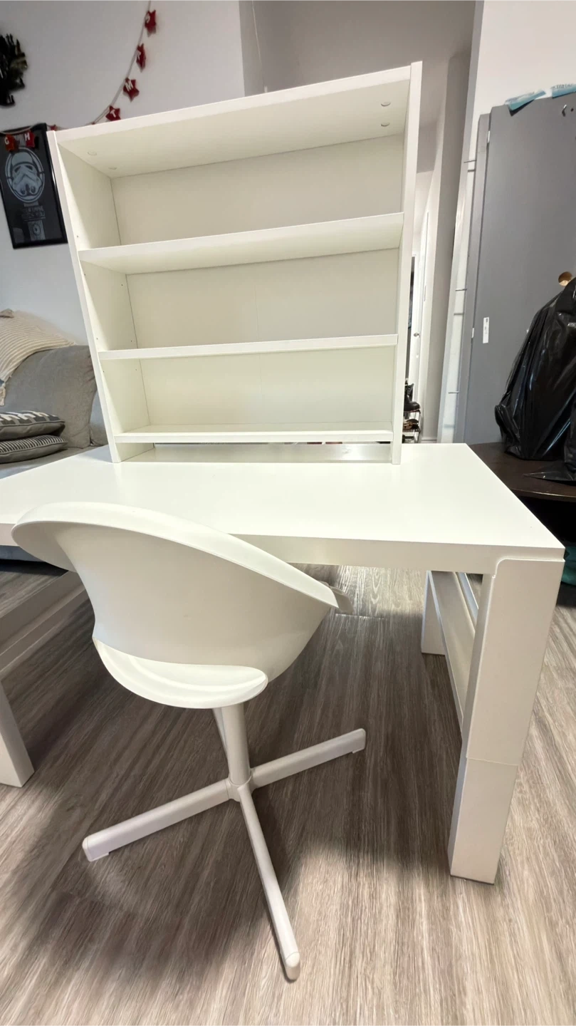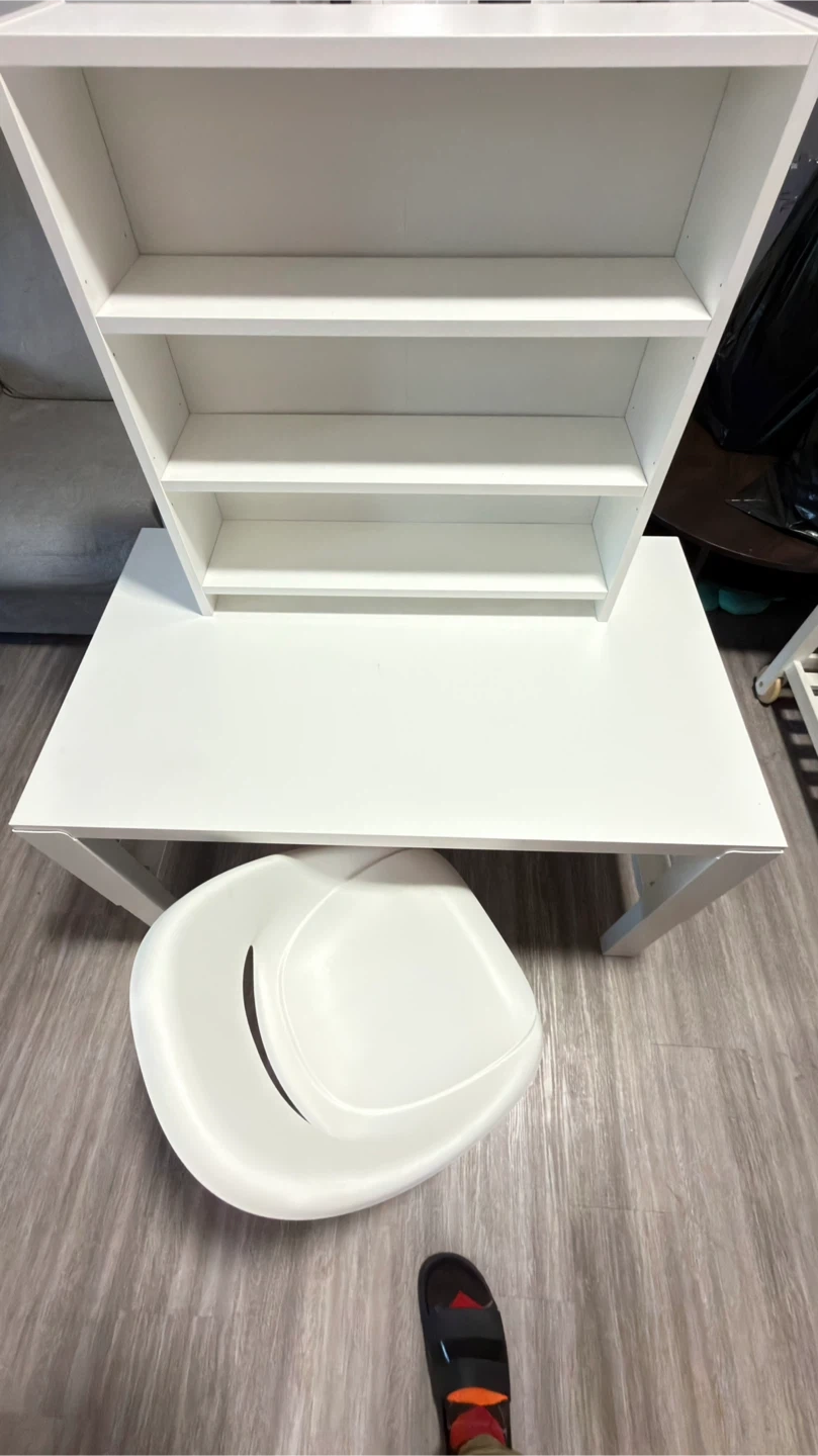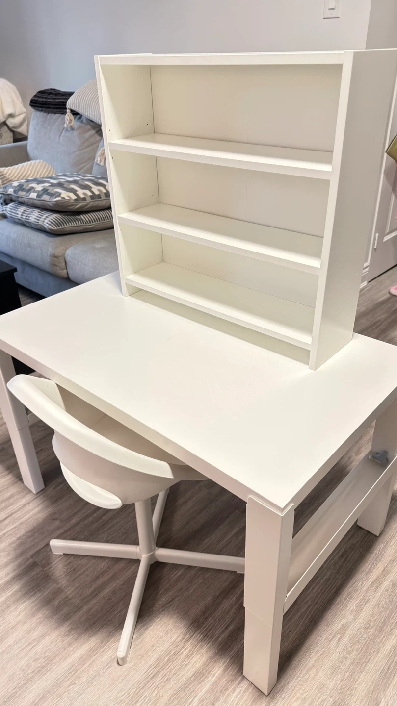 Selling a toddler/kid desk, in white. Comes with the optional shelf and chair. Frame has three height settings so it can grow with your child.