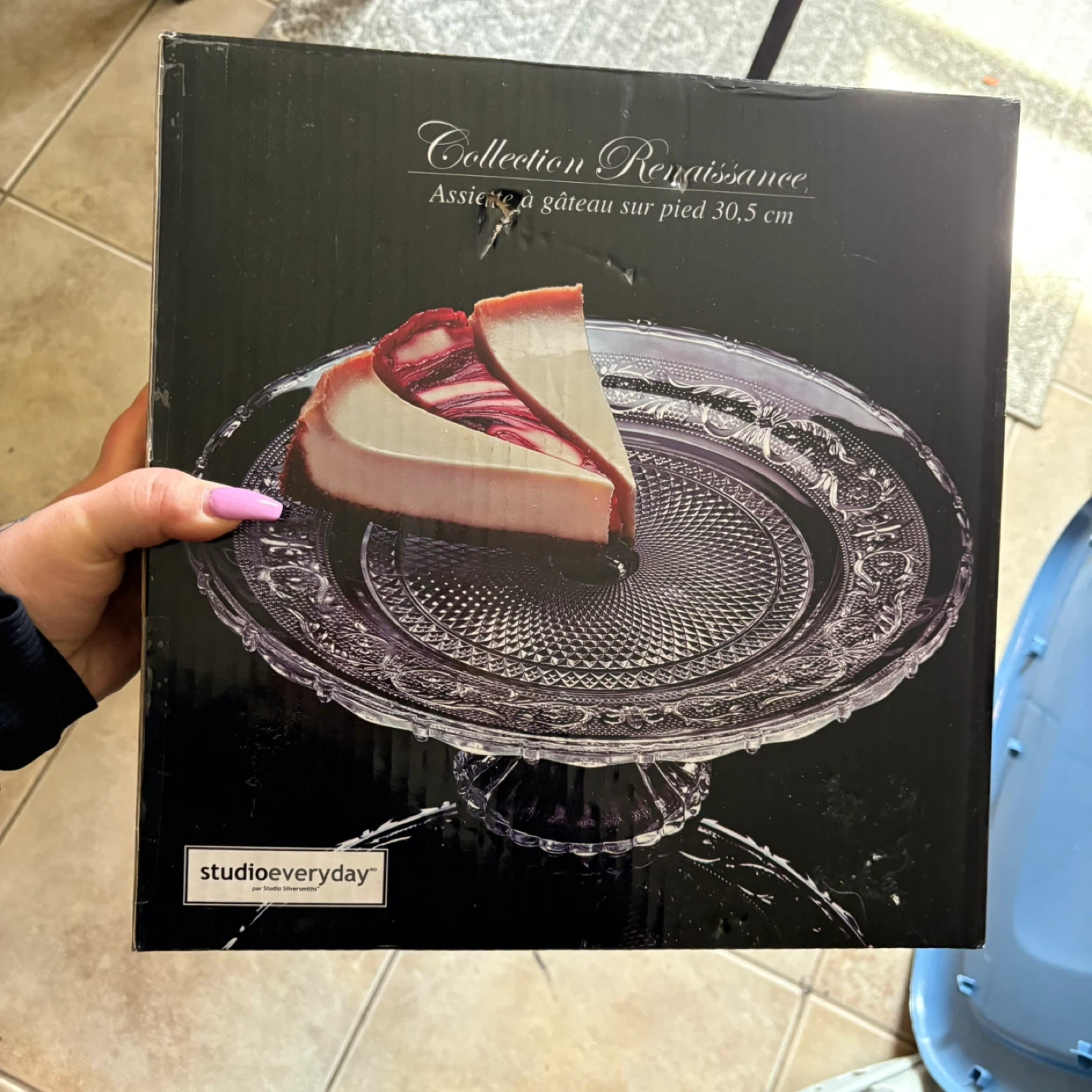 This is the Studio Everyday Collection Renaissance cake stand. It's made of clear glass with an embossed design. The stand measures 30.5 cm across.