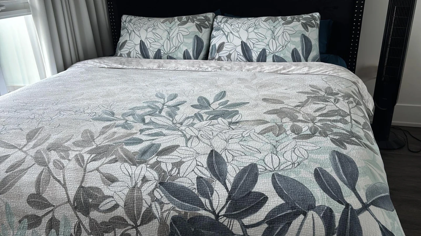 This king size bed frame and bed with modern design with a deep tufted headboard upholstered in a velvet fabric. I bought the mattress from sleep country and the bed frame from way fair. Everything is in great condition im downsizing my bed. Really comfortable to sleep on. I paid approximately $2000 plus for this set. It includes wooden slats for mattress support. Perfect for any bedroom looking for an upgrade!