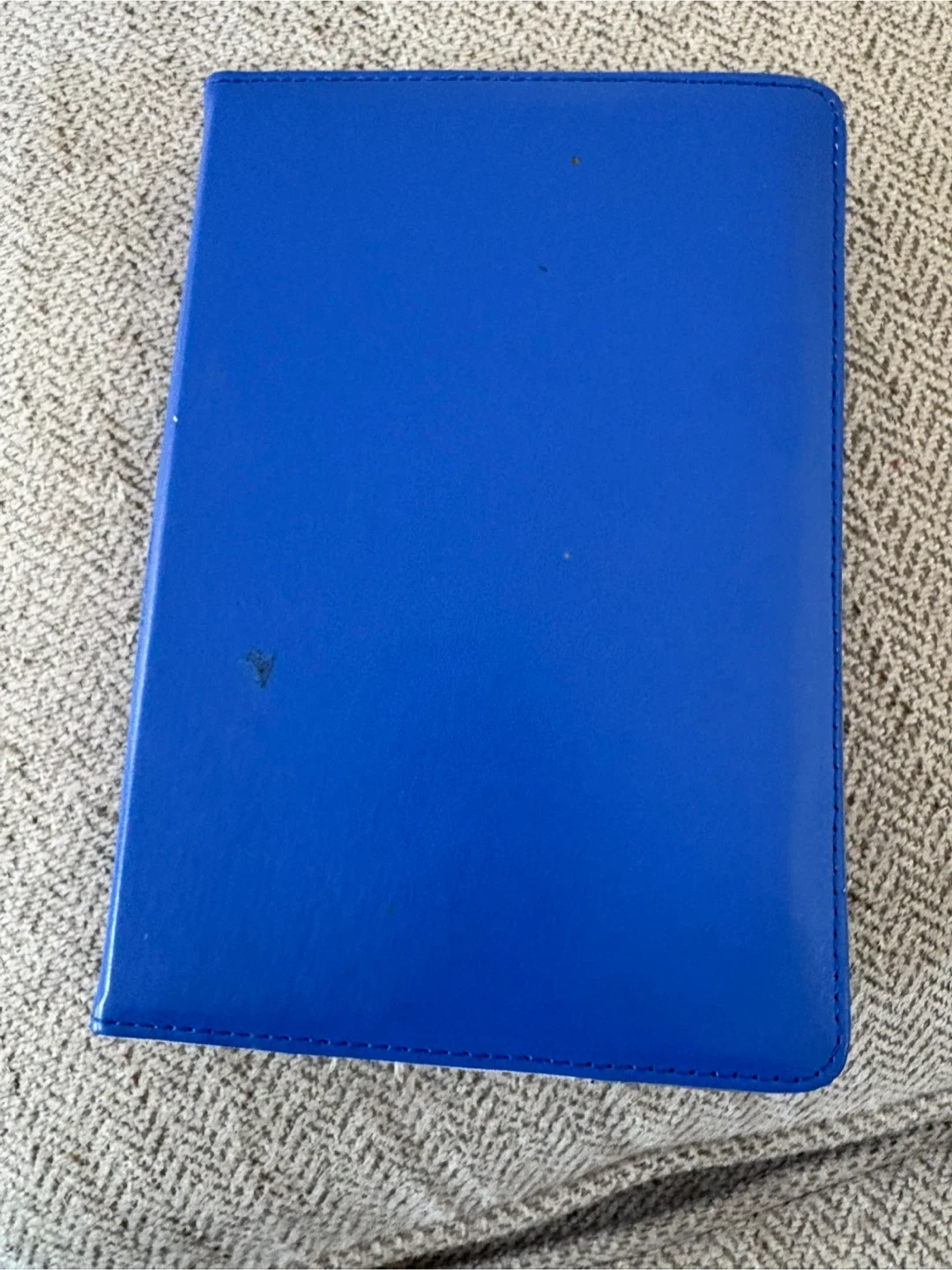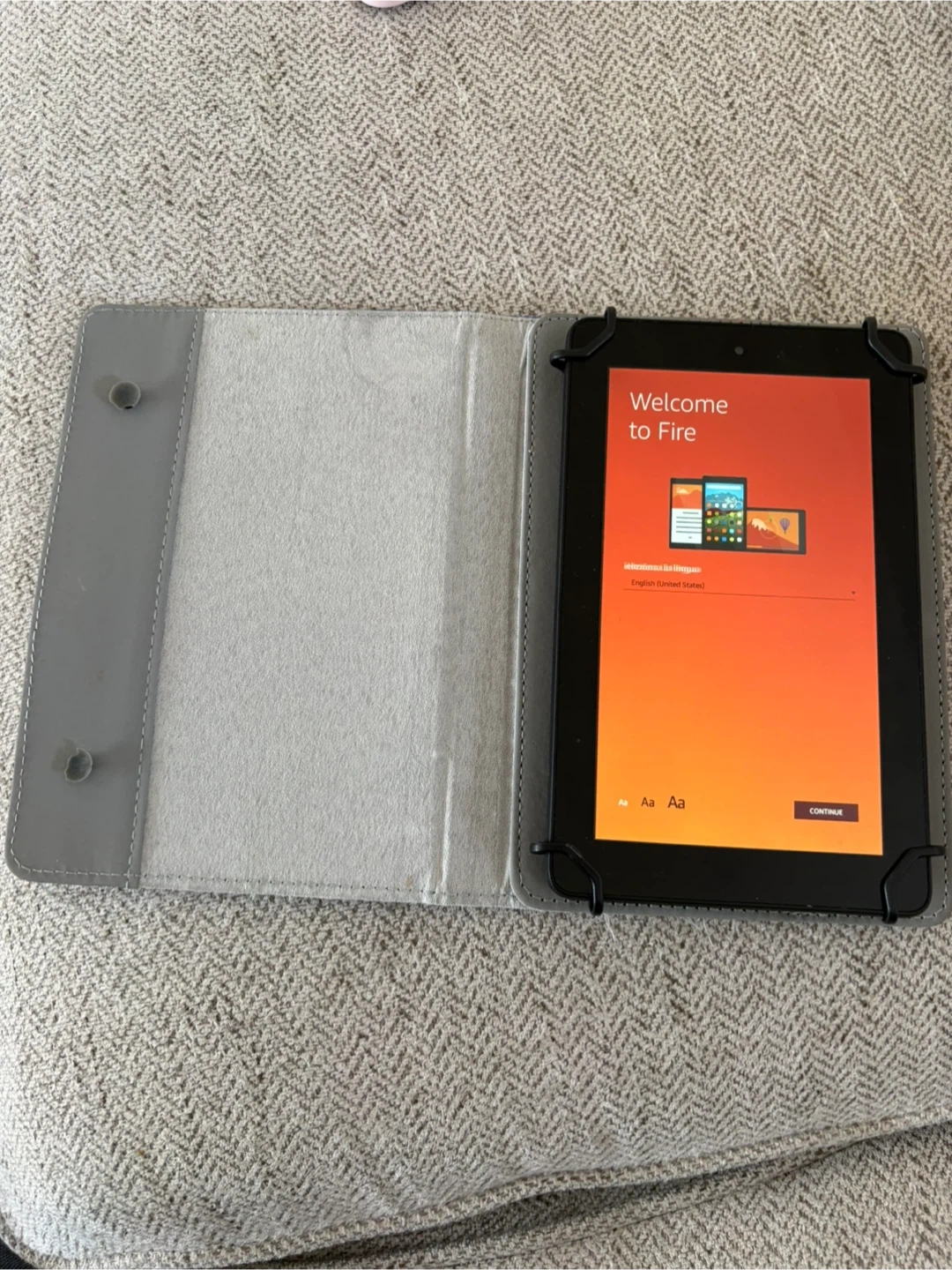 This is an Amazon Fire tablet, a handy device for everyday use. It comes with a protective blue case and a charging cable labelled 'Amazon'. The tablet is powered on and ready for setup.