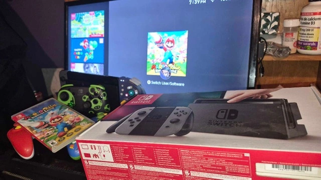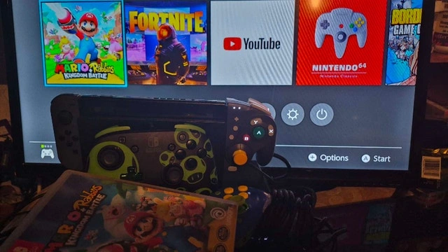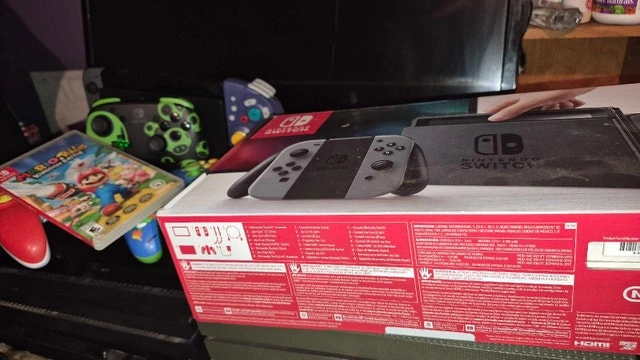 Launch Model Switch v1. 32GB. Able to be software or hardware modded w atmosphere or picofly. 128GB SD Card installed. 7 digital games included as shown in pictures, + mario and rabbids cartridge. 3 wired pro controllers, game cube grip joycon, dock, power supply, HDMI cables and box included. In excellent shape for a launch model. No dings, dents, or gouges. $250 or best reasonable offer. Can drop off in east GTA if offer is reasonable.