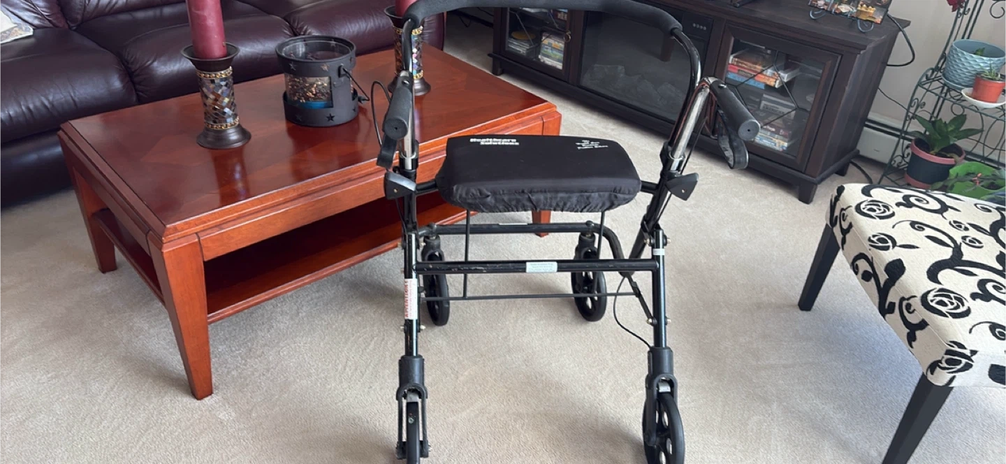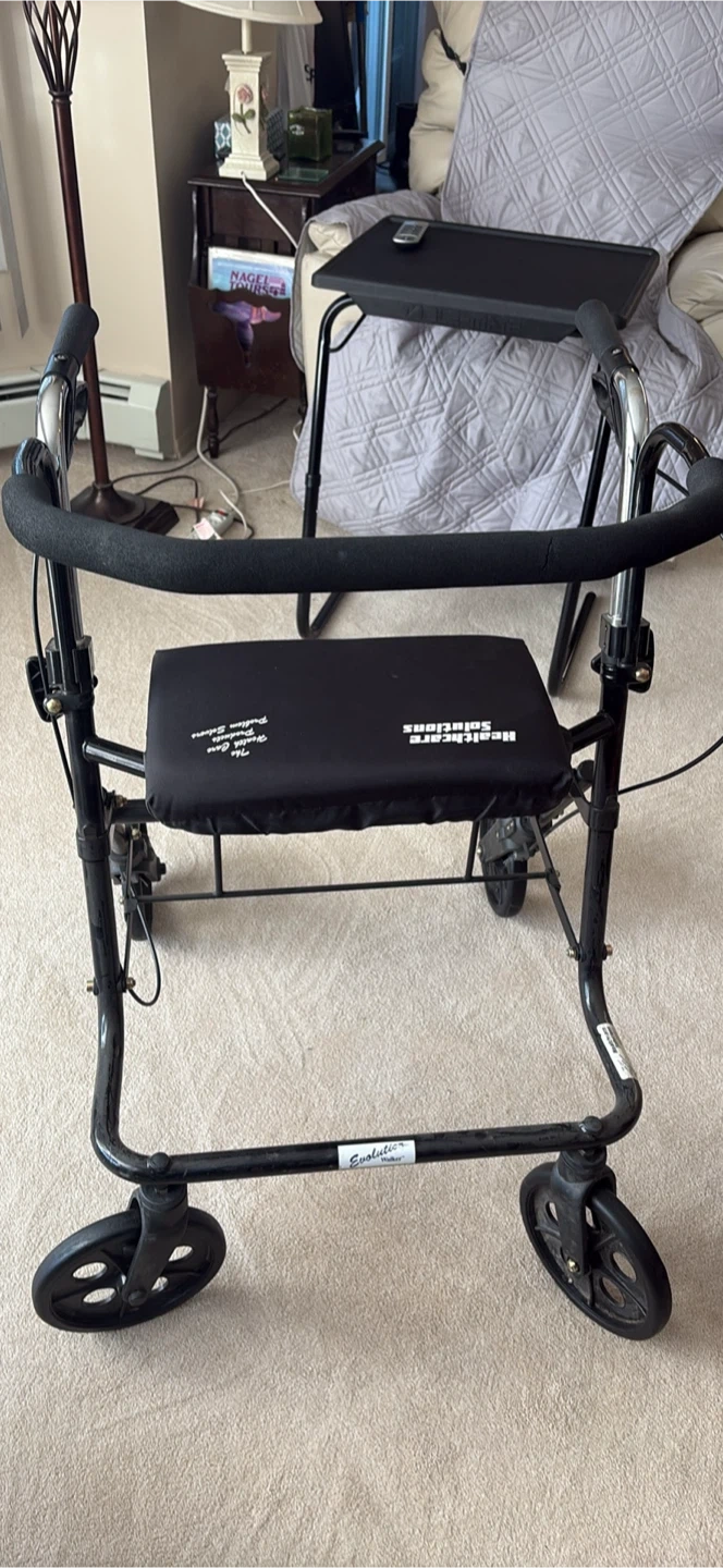 This is an Evolution rollator walker with a seat. It has adjustable handles for comfortable height. Easy to manoeuvre around the house or on sidewalks. Brakes engage securely for safety.