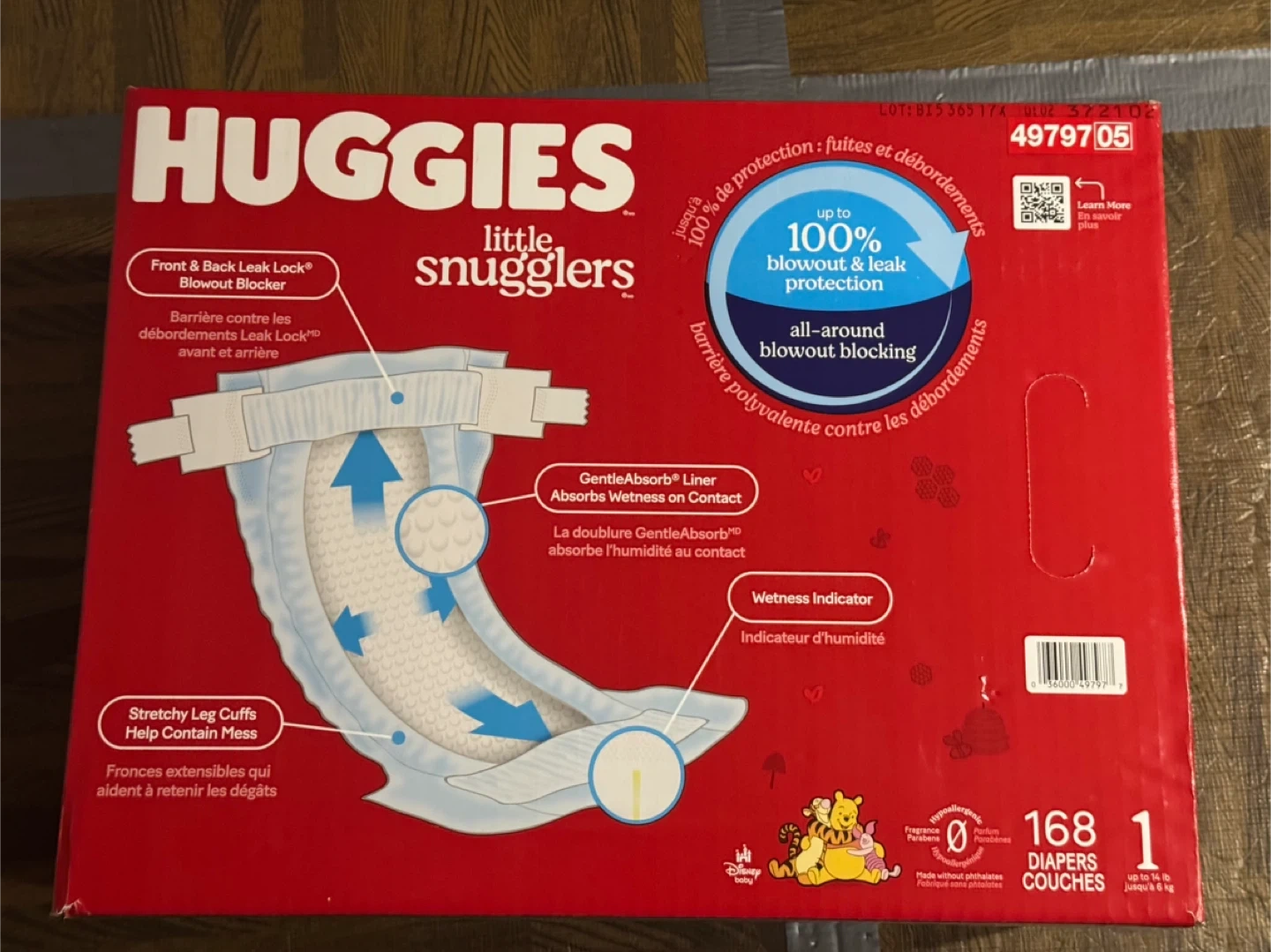 These Huggies Little Snugglers diapers offer up to 100% blowout and leak protection with a GentleAbsorb Liner. They feature stretchy cuffs to help contain messes and a wetness indicator. This box contains 168 diapers suitable for babies up to 14 lbs.