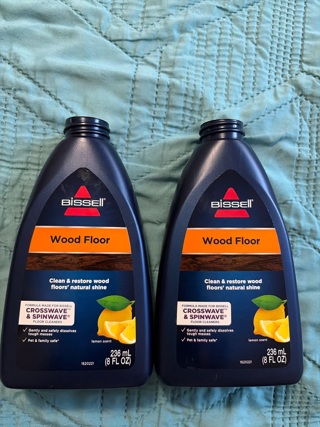 These are two bottles of Bissell Wood Floor cleaner, each with a 236 ml (8 FL OZ) capacity. It's formulated for cleaning and restoring wood floors with a natural shine. The cleaner has a lemon scent and is safe for pets and families.crosswave and spinwave.$15 for 2