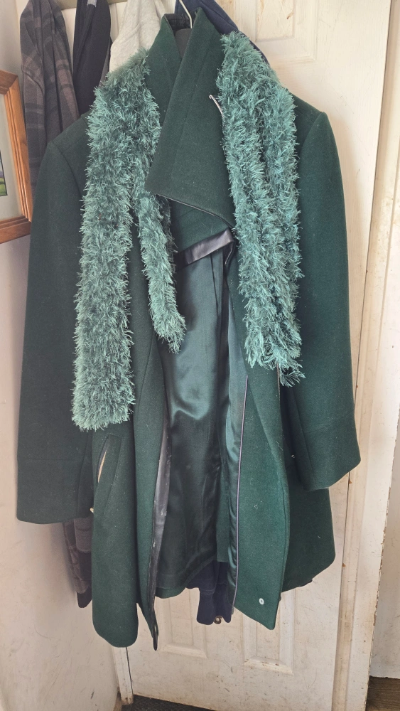 Long emerald green peacoat. Features a teal faux fur trim around the collar. Fully lined. Pockets on the sides.