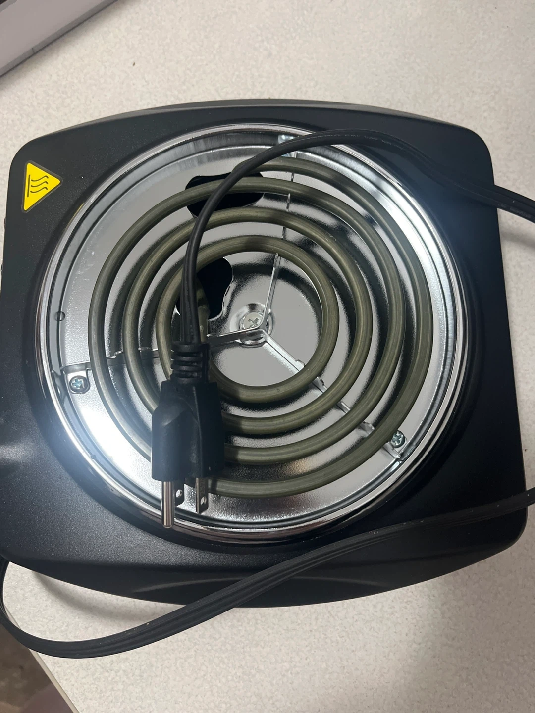 This is a Master Chef single-burner cooktop. It features variable temperature control. The heating element is a coil type. It's great for small kitchens or dorm rooms!
