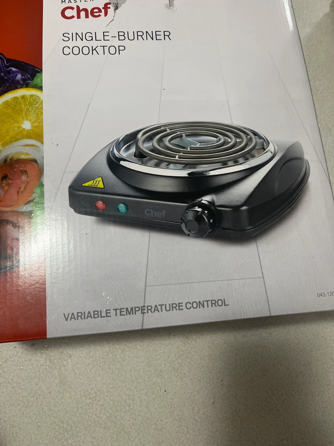 This is a Master Chef single-burner cooktop. It features variable temperature control. The heating element is a coil type. It's great for small kitchens or dorm rooms!
