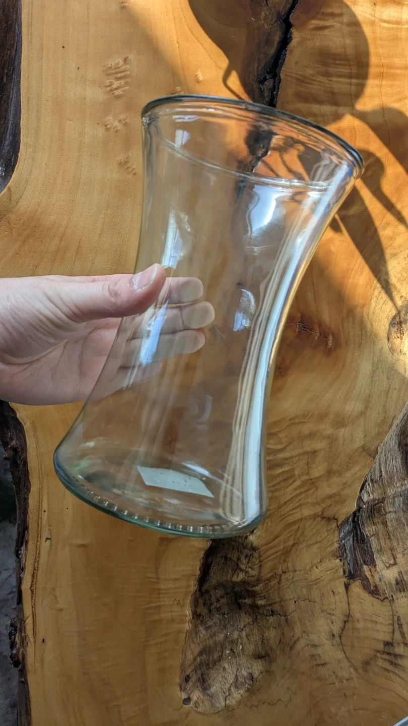 This glass vase is 7.75 inches high, the mouth is 5 inches wide and has only been used once! It's perfect for displaying flowers, and has no chips or cracks!