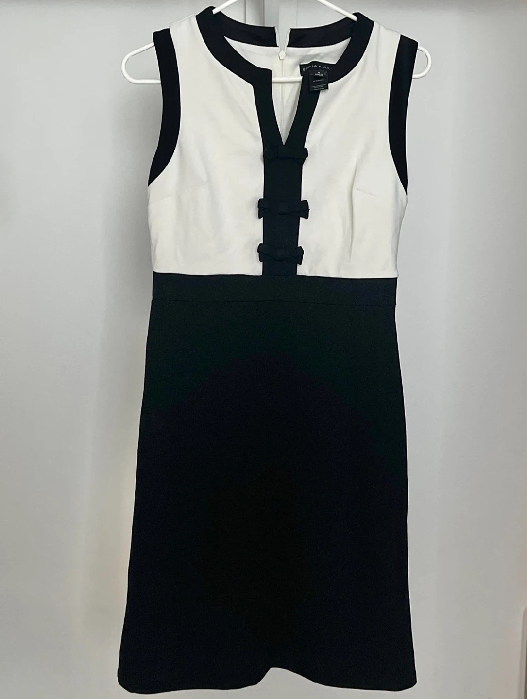 This is a white and black sleeveless sheath dress. It has a V-neckline with black trim and decorative knot details at the bust. The dress zips up the back. A classic addition to any wardrobe!