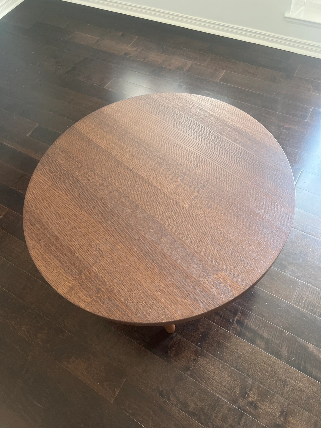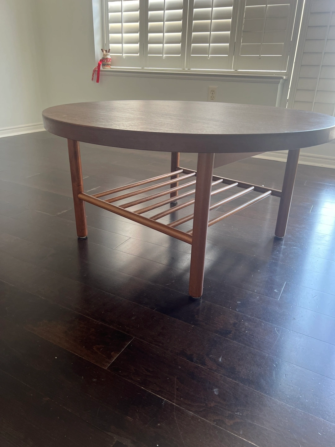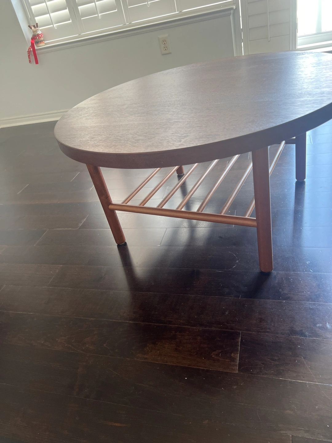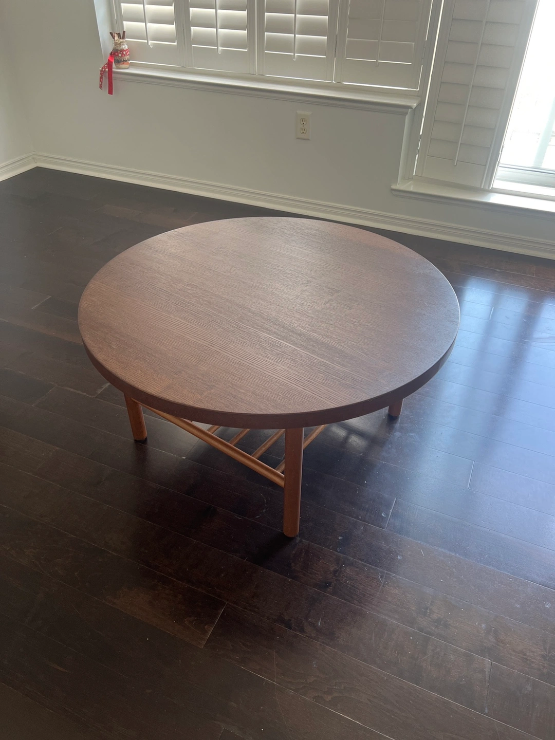 A round wood coffee table with a lower shelf. It has four legs. The top of the table is a dark brown wood. It measures approximately 36 inches in diameter. It has a simple modern design. The table has been used in a home and shows small signs of wear but very minor