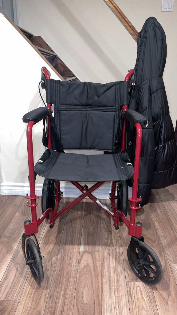 Selling a transport wheelchair with a red frame and black seat. It's in good condition and ready to use