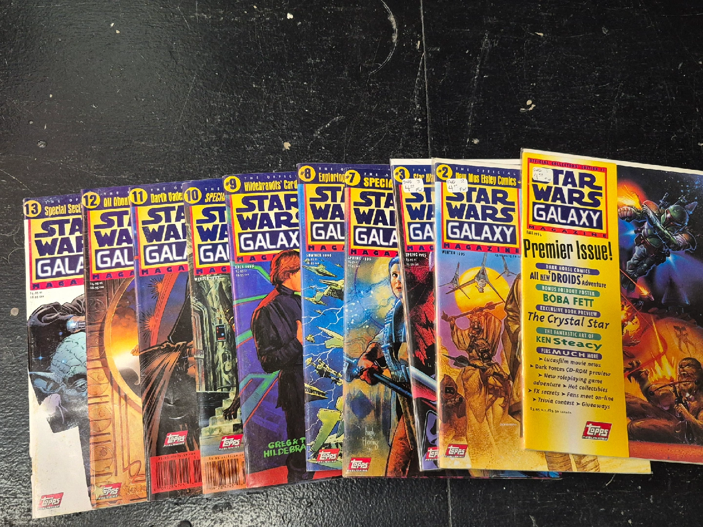 Selling a collection of Star Wars Galaxy Magazines. Includes Premier Issue Fall 1994, Spring 1995, Winter 1995, Spring 1996, Summer 1996 and others. Great for any Star Wars fan!