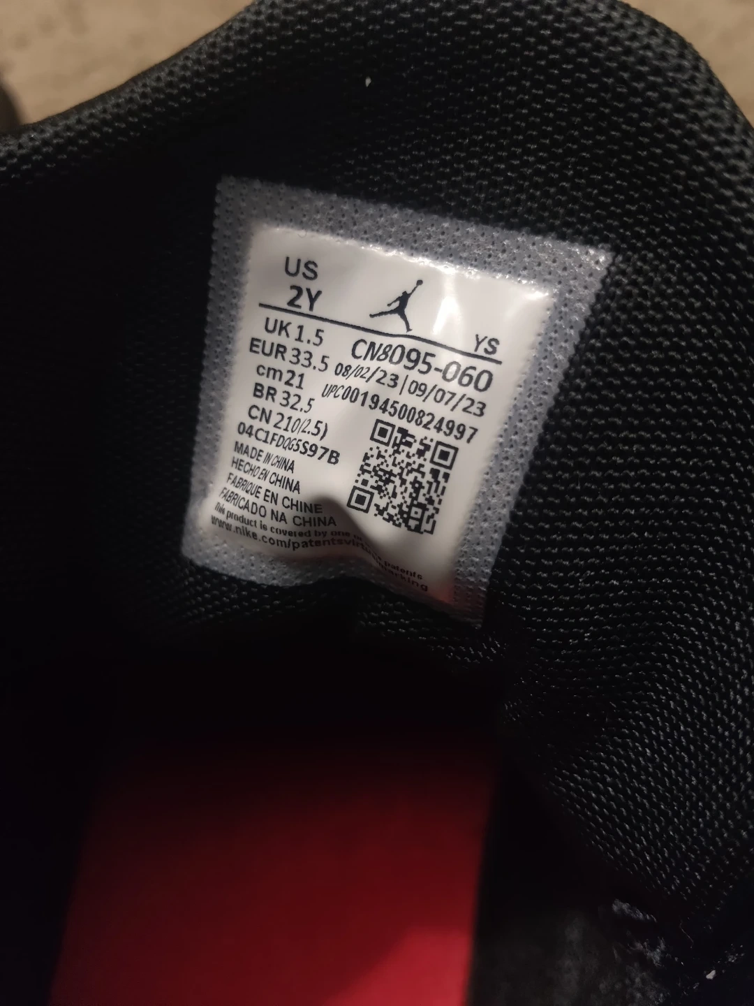 Youth Jordan sneakers in black with red accents. Velcro strap closure and laces. Size 2Y.