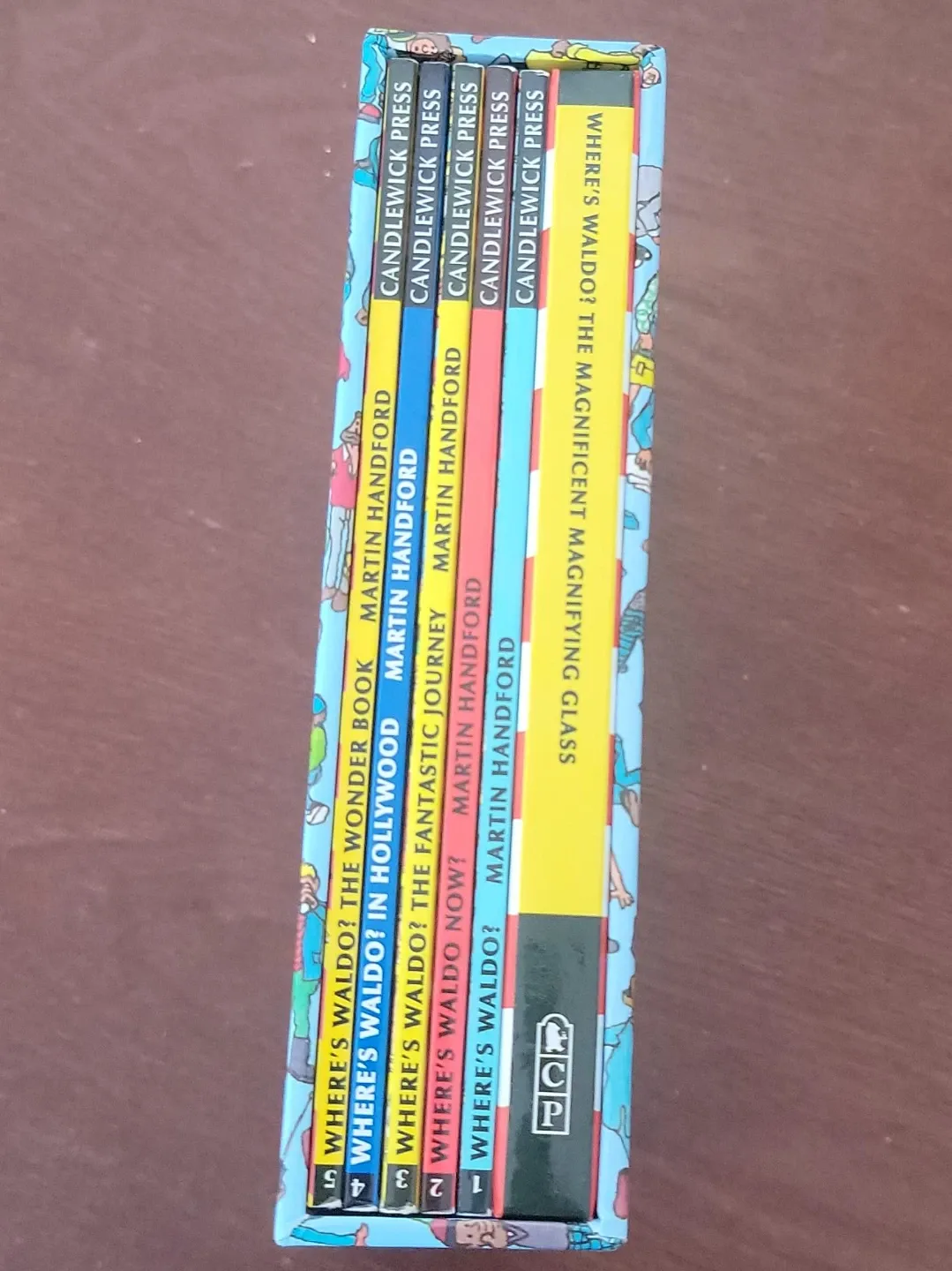 This is a collection of 5 Where's Waldo? books by Martin Handford, published by Candlewick Press. Titles include: The Wonder Book, In Hollywood, Now?, The Fantastic Journey, and Where's Waldo?. These books are great for finding Waldo!