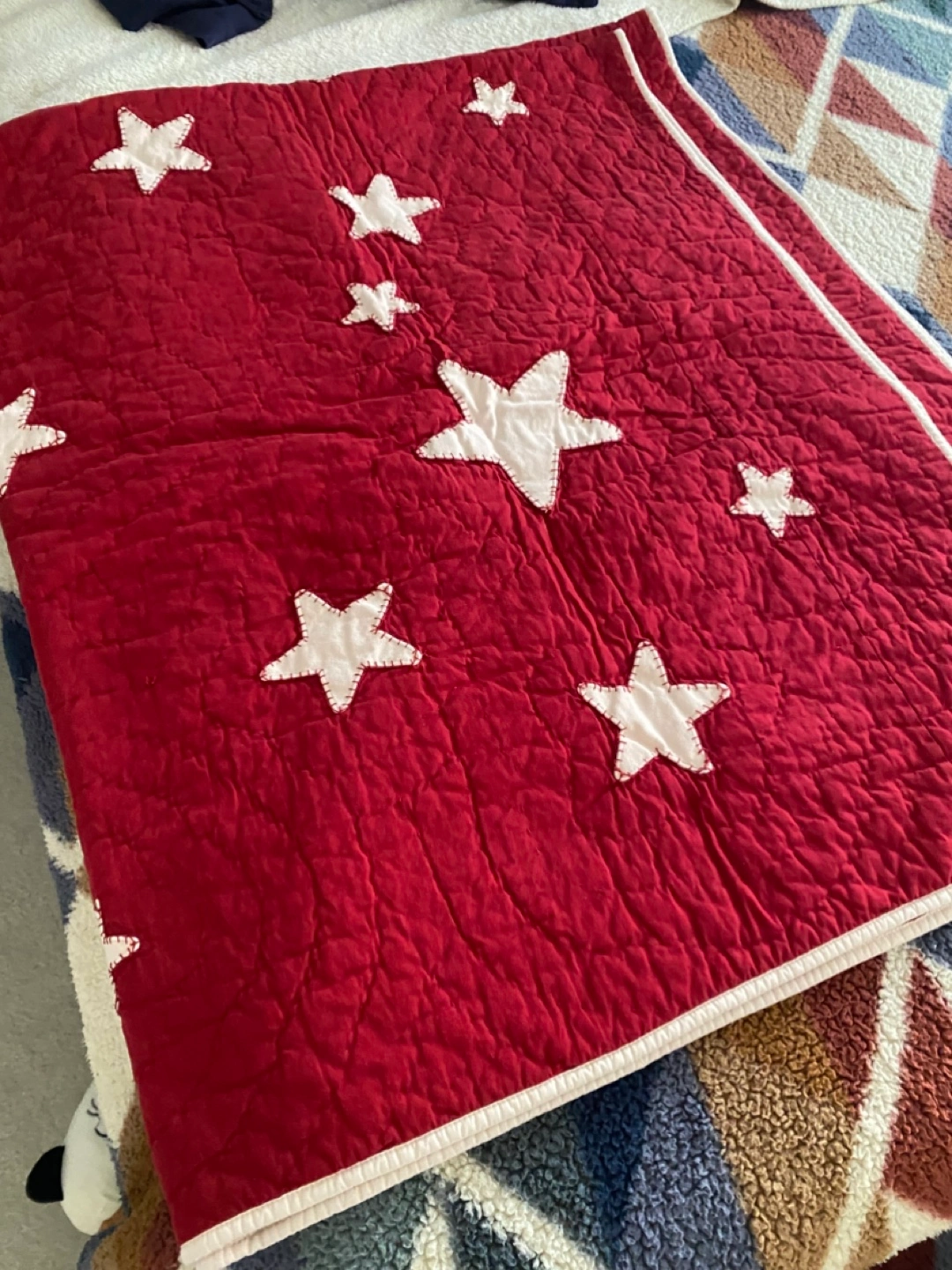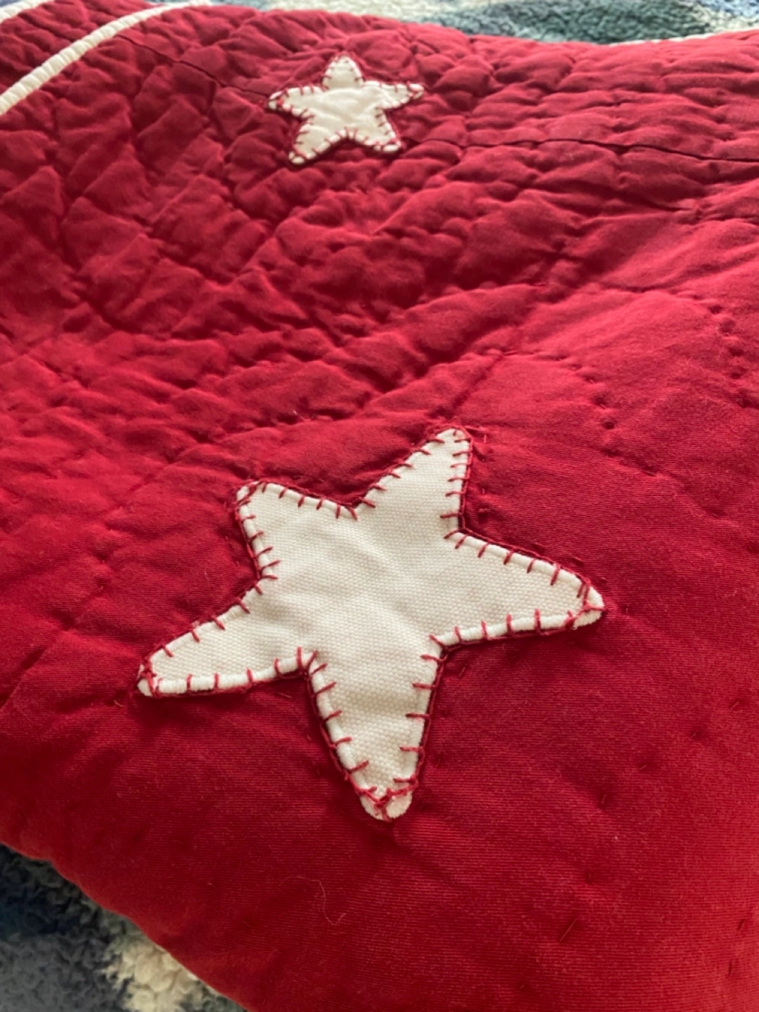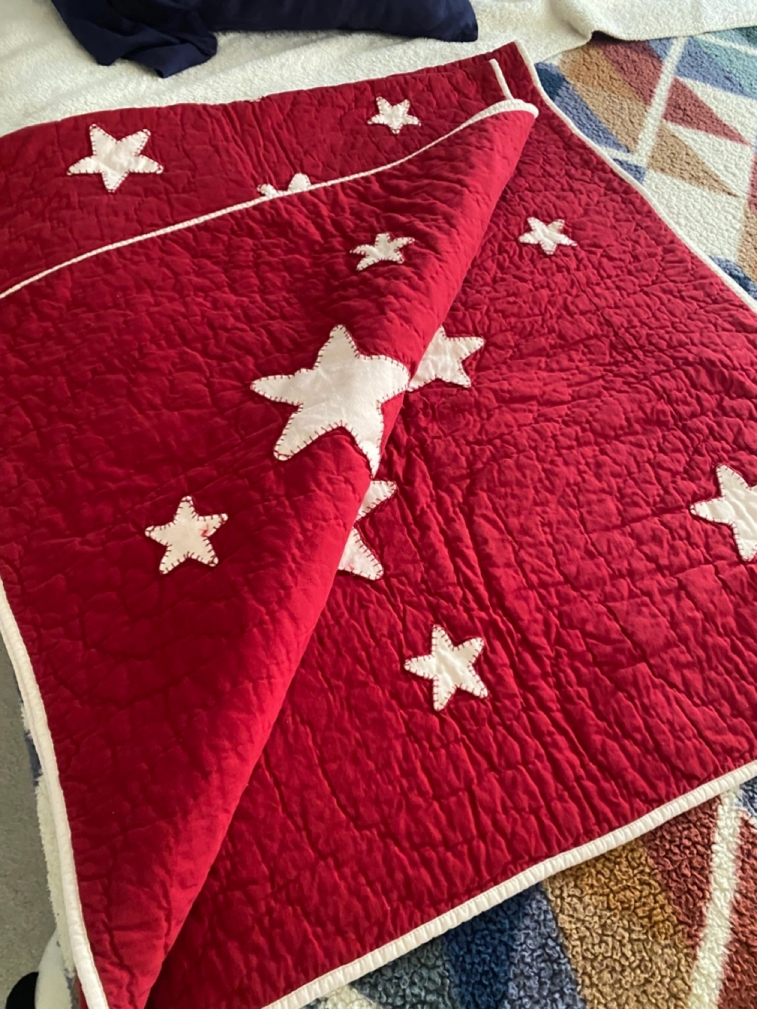 Adorable red quilt. Features white stars. Soft and cozy. Perfect for a child's room. Size double or queen.