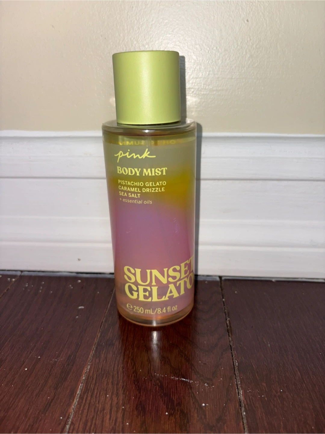 Victoria's Secret PINK Sunset Gelato body mist. Features a pistachio gelato, caramel drizzle, and sea salt scent with essential oils. This mist is 250 ml or 8.4 fl oz. It's formulated without artificial dyes and is vegan.