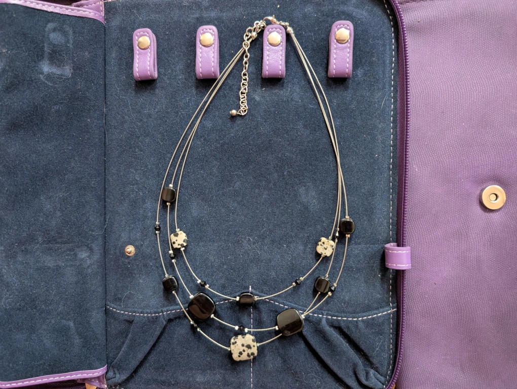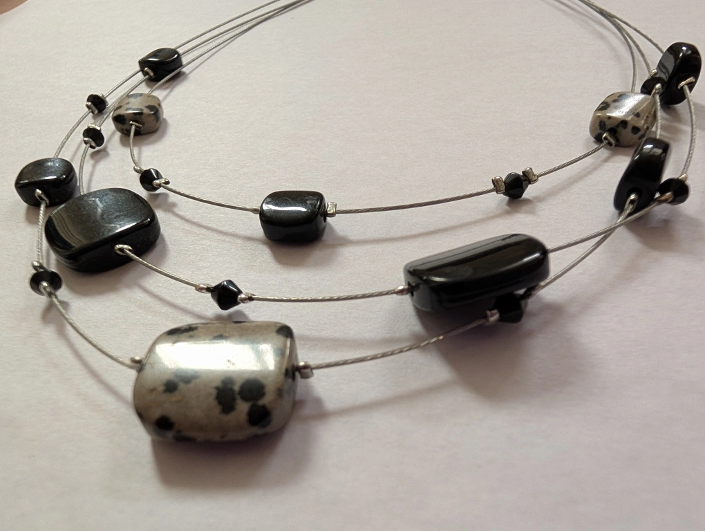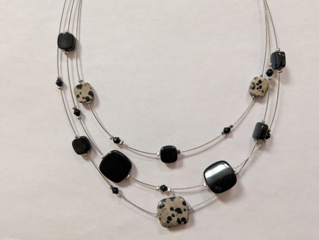 Beautiful layered necklace. Features black onyx and dalmatian jasper colored stones. Silver-tone metal wires and clasp. Elegant and stylish.