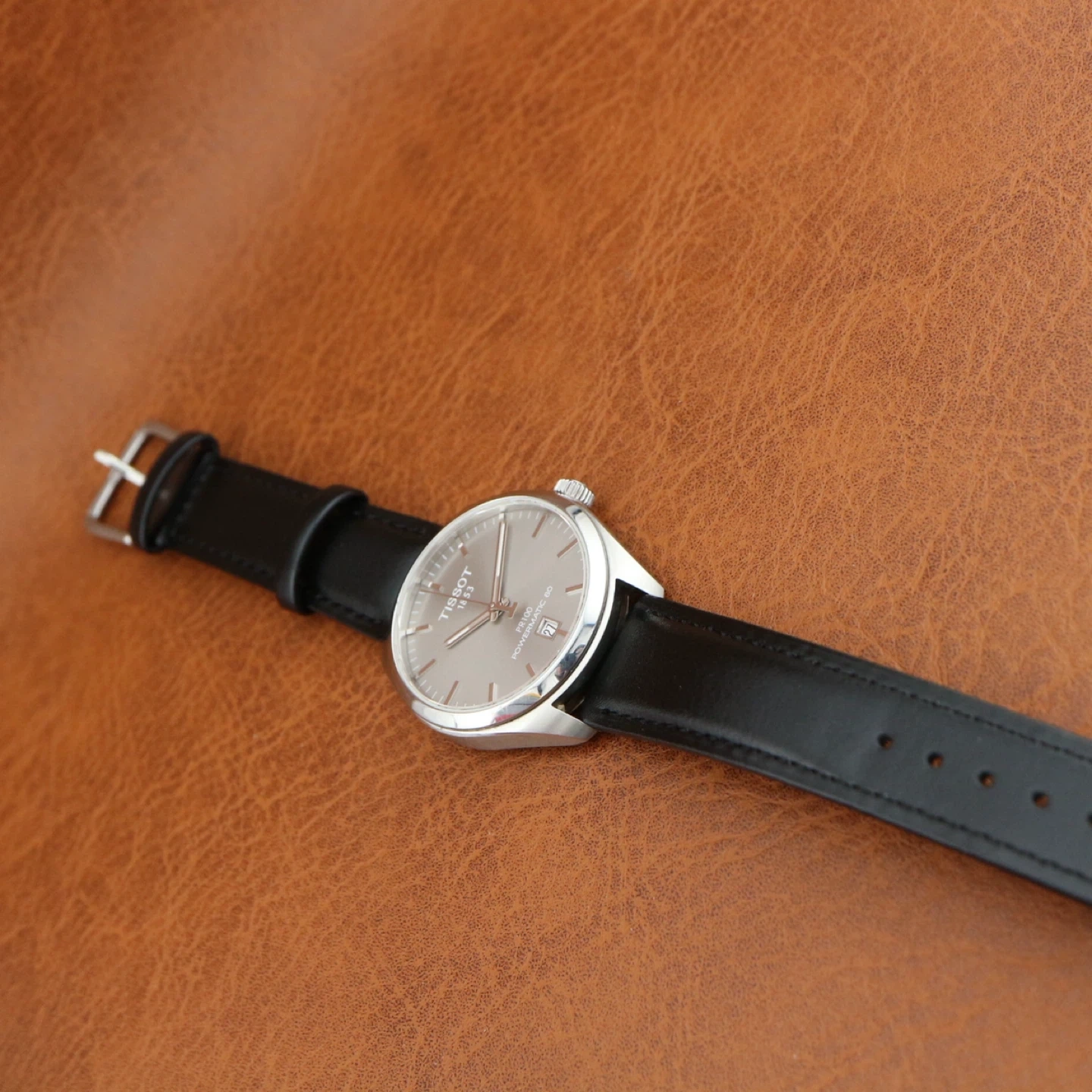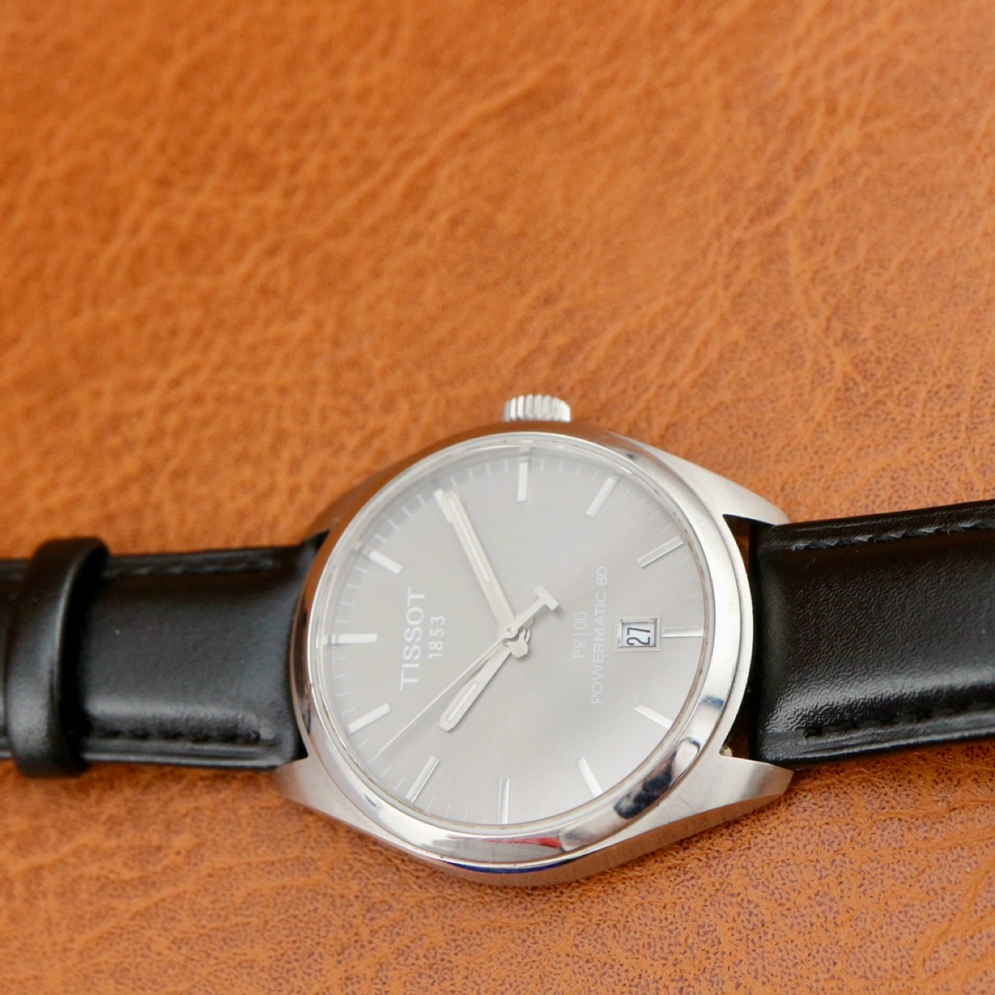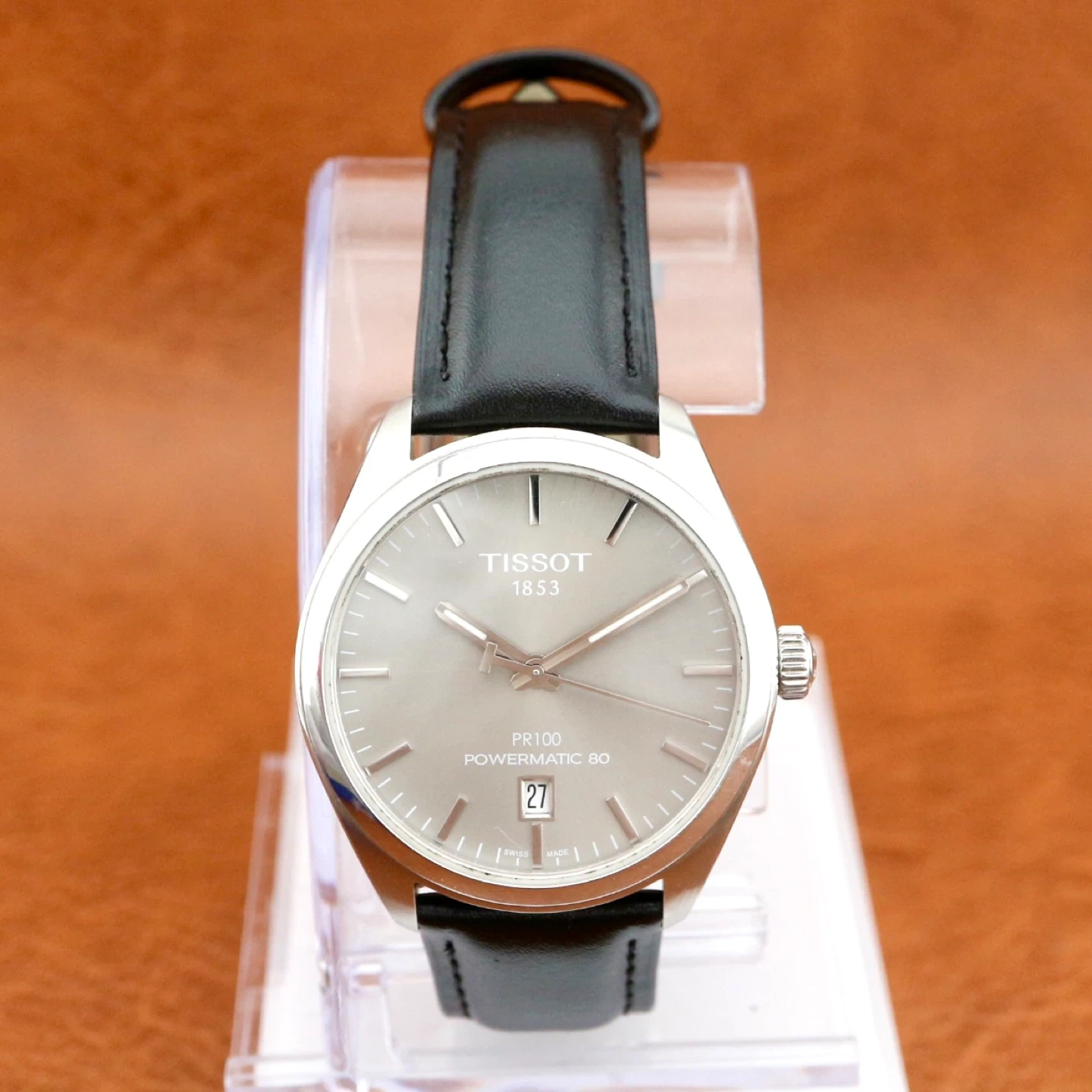 This Tissot watch features a classic design with a silver dial and a black leather strap. It's powered by a Swiss automatic movement, the PowerMatic 80. The watch includes a date display at the 3 o'clock position.