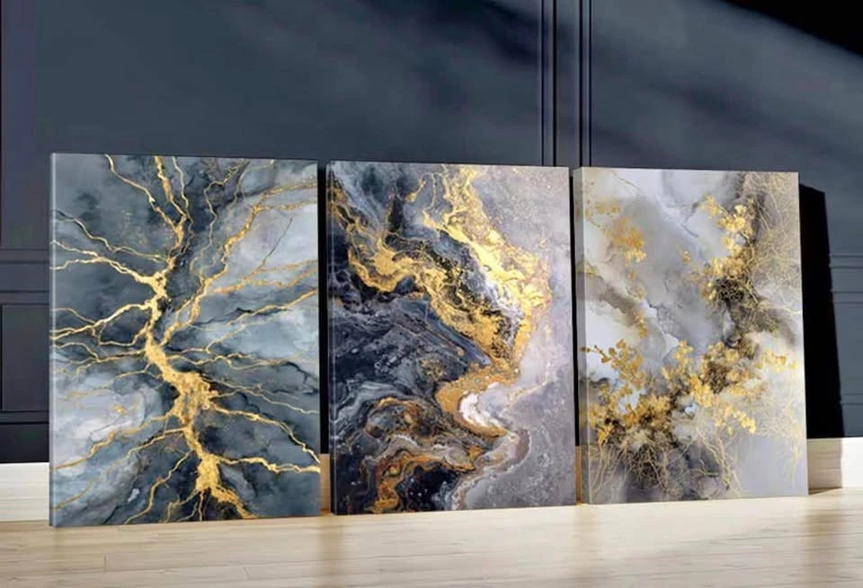 Set of 3 framed wall arts, featuring Golden Veins and Abstract Waves oil painting style prints. Stylish canvas prints, modern poster painting artwork for living room, bedroom, and elegant home office decor.
