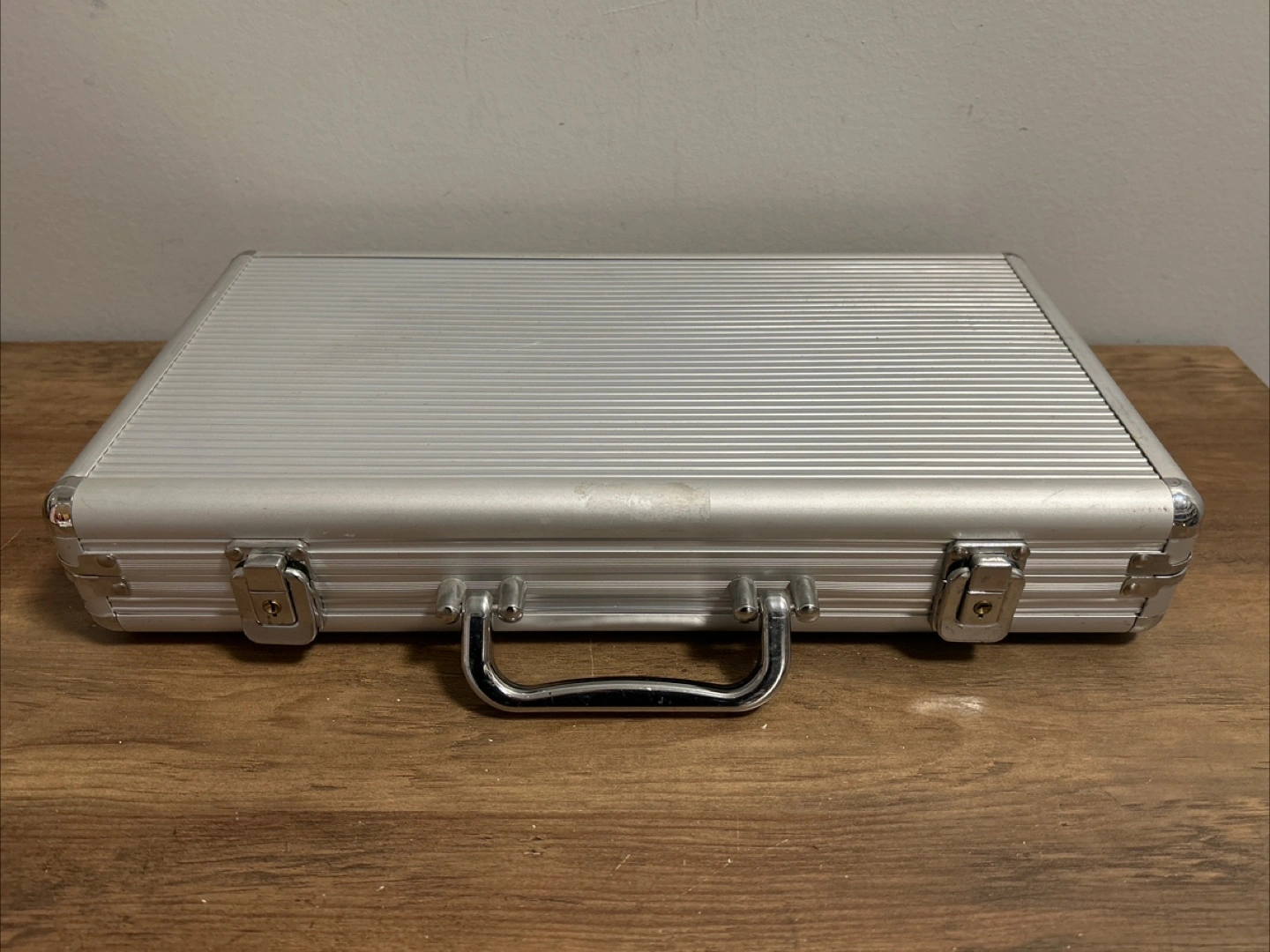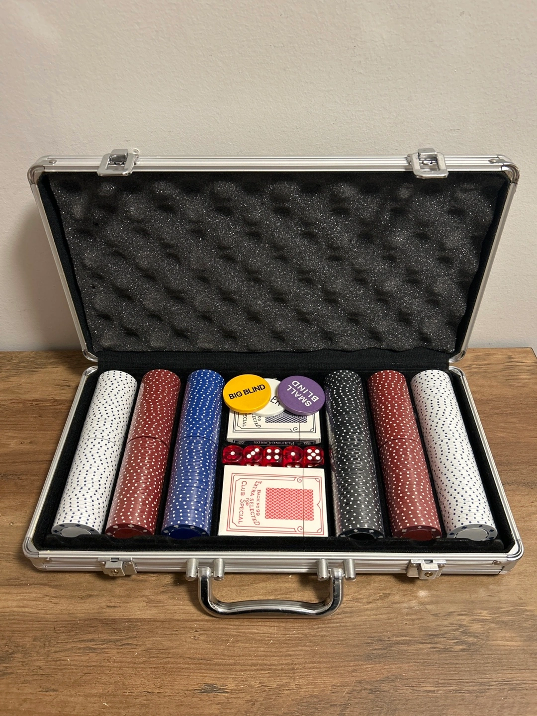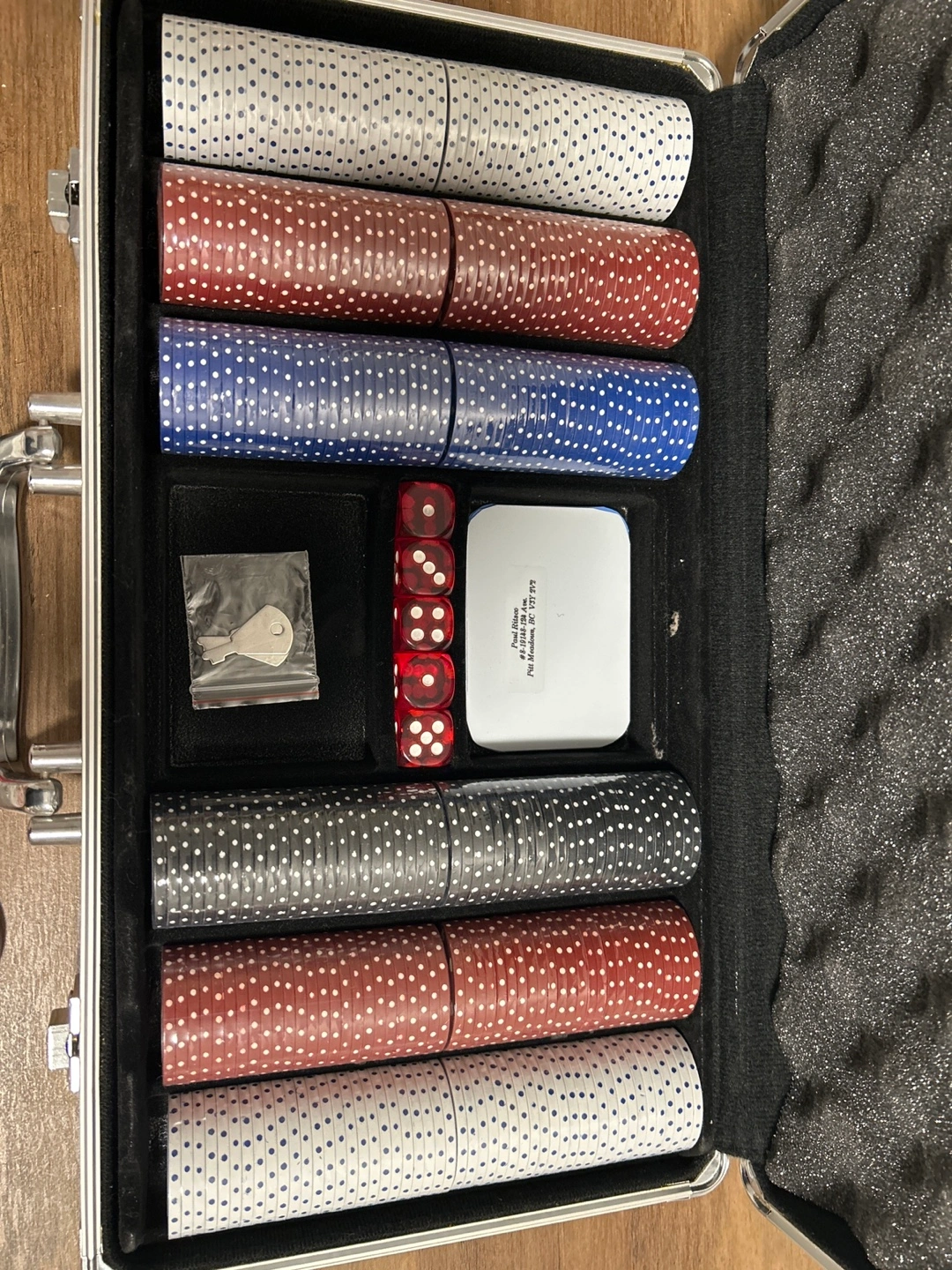 This is a poker chip set that includes chips, dice, two decks of cards, and dealer buttons. It comes in a silver aluminium case with a lock and key. Perfect for game nights!
