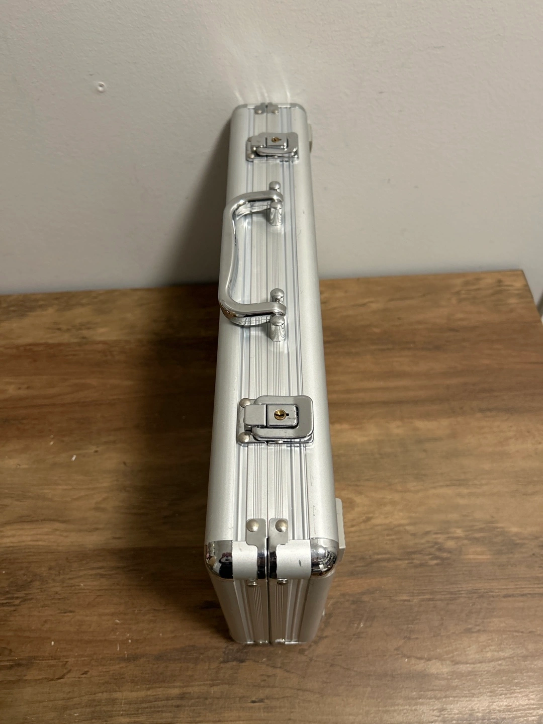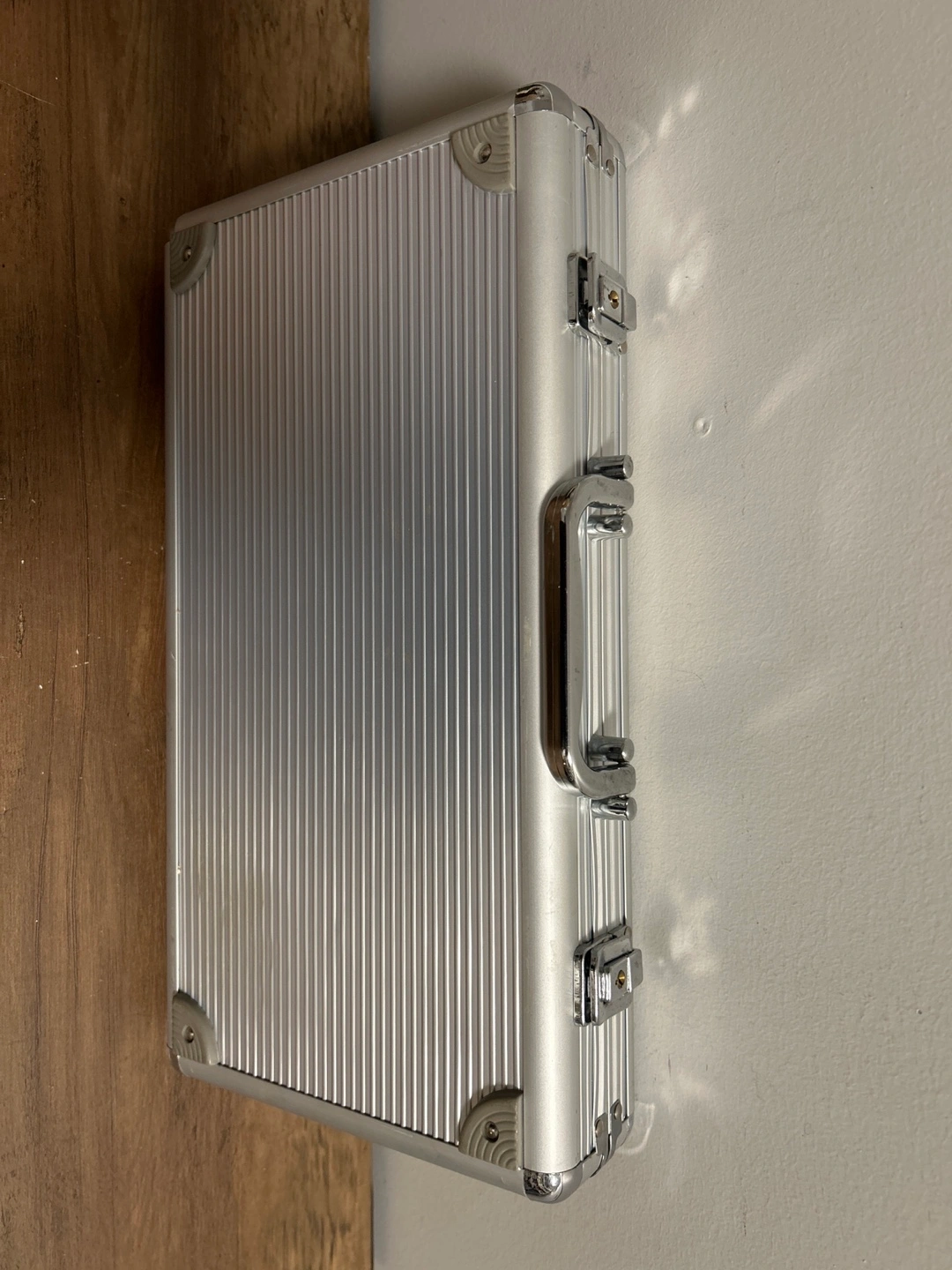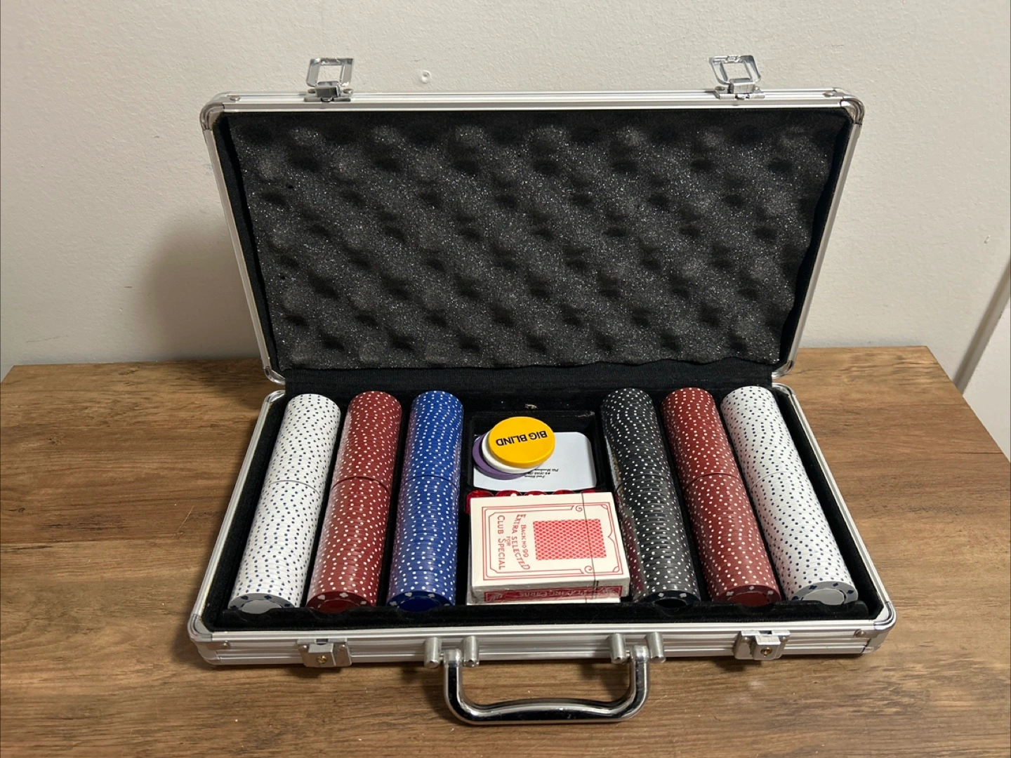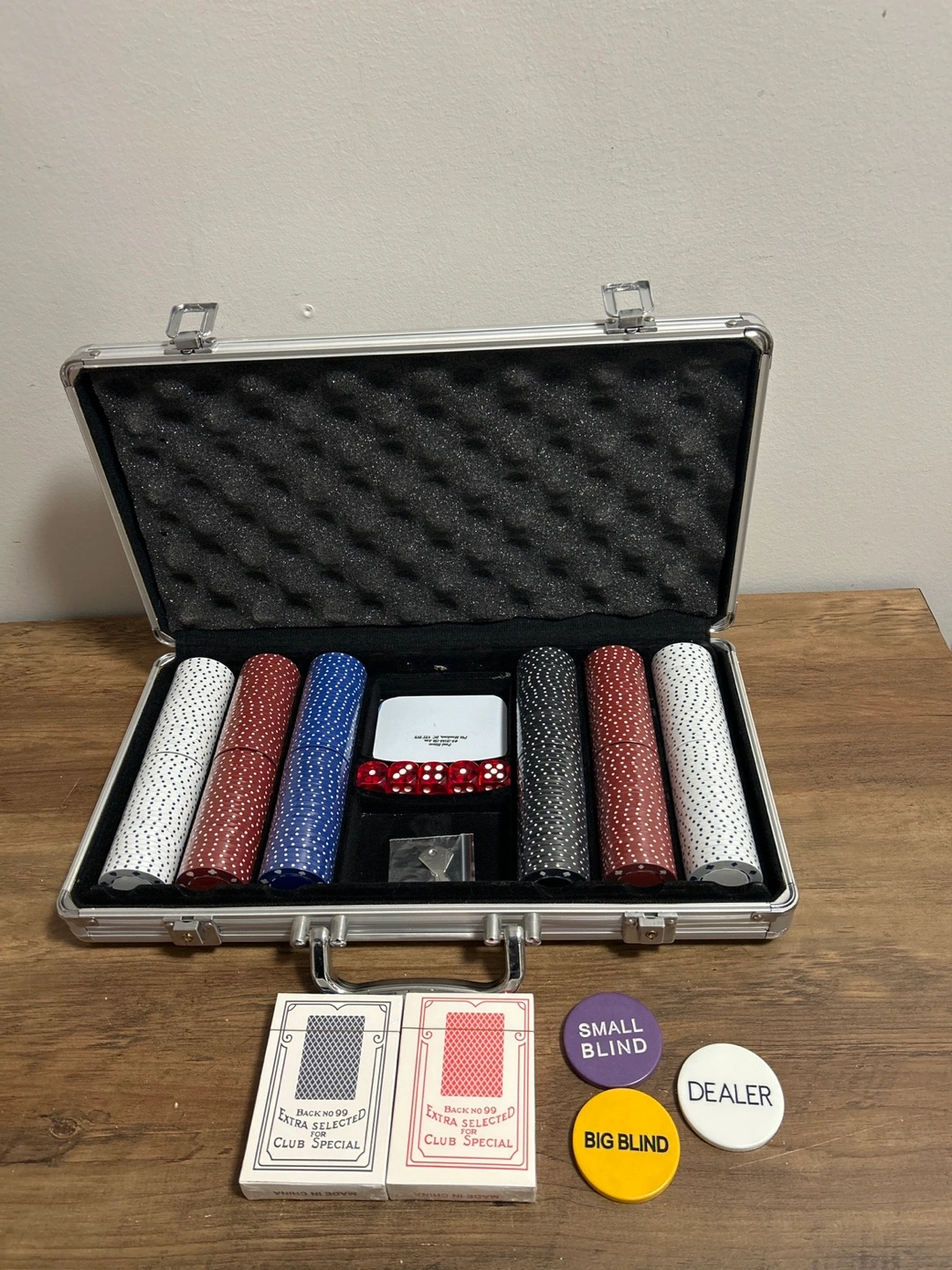 This is a poker chip set that includes chips, dice, two decks of cards, and dealer buttons. It comes in a silver aluminium case with a lock and key. Perfect for game nights!