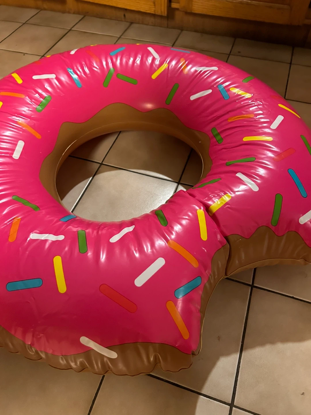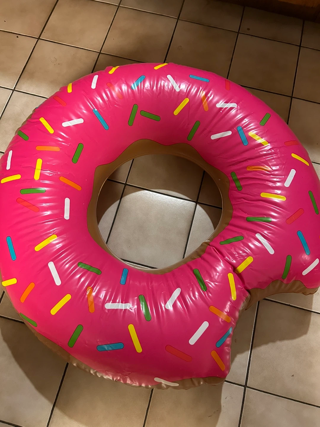 This is a fun, inflatable donut-shaped pool float. It's designed to look like a pink frosted donut with colorful sprinkles. Great for relaxing by the pool or at the beach!